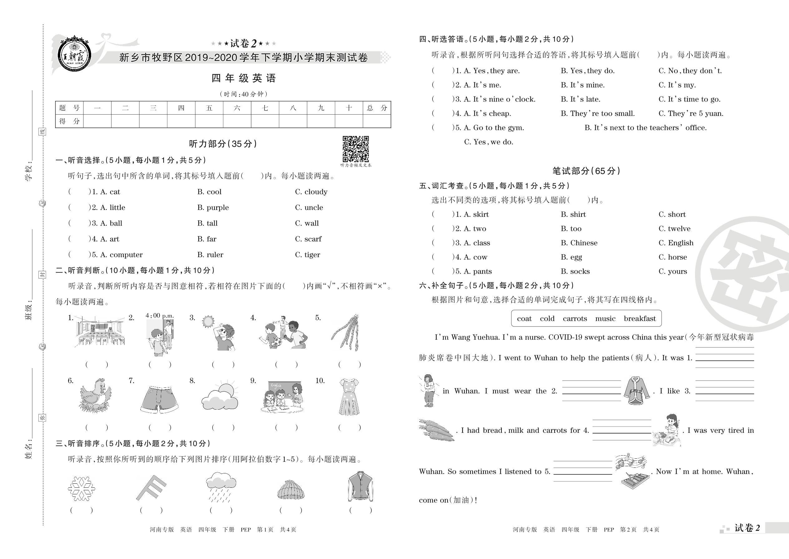 2019-2020学年第二学期新乡市牧野区四年级英语试卷(PEP版)【2】
