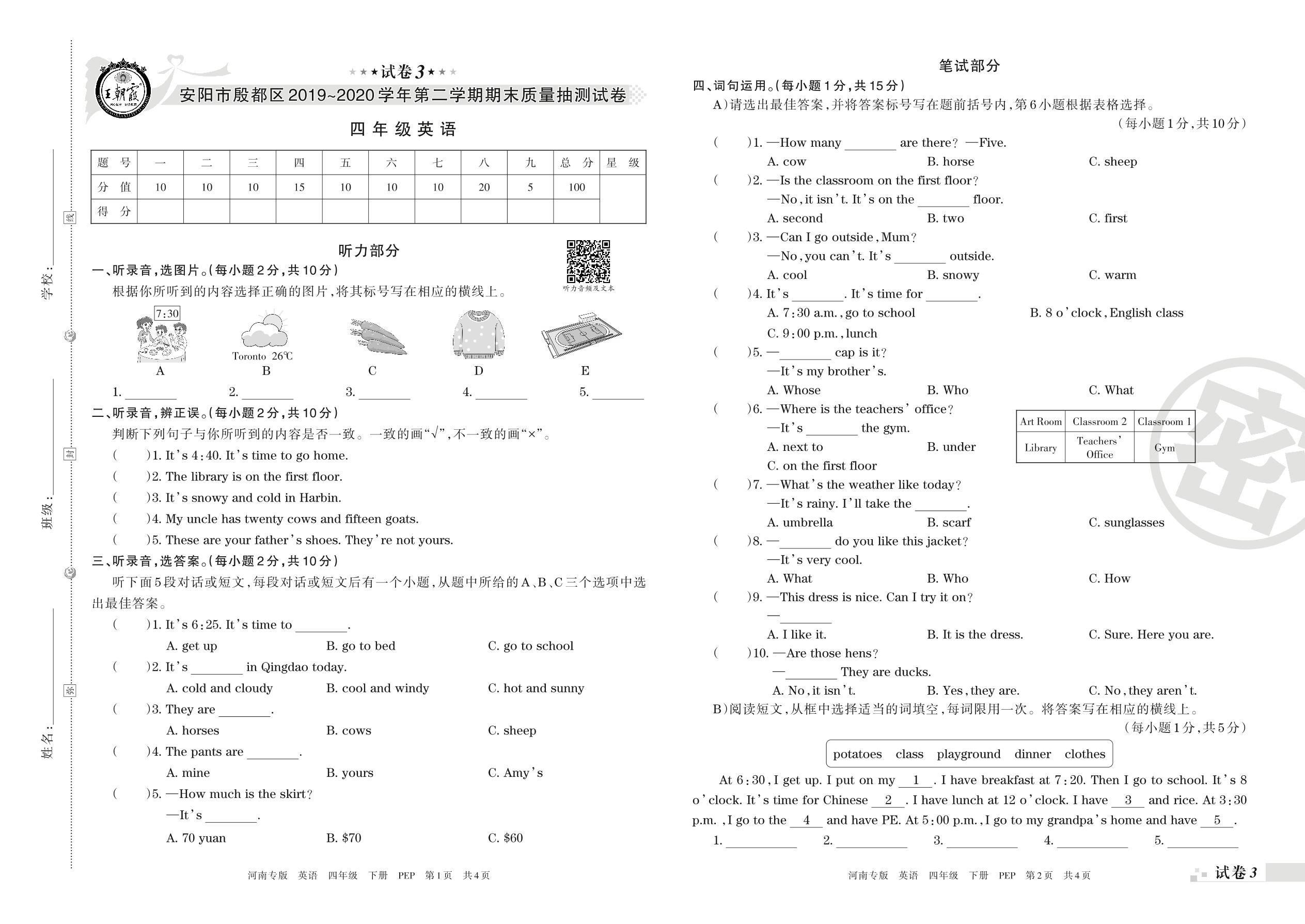 2019-2020学年第二学期安阳市殷都区四年级英语试卷(PEP版)【3】