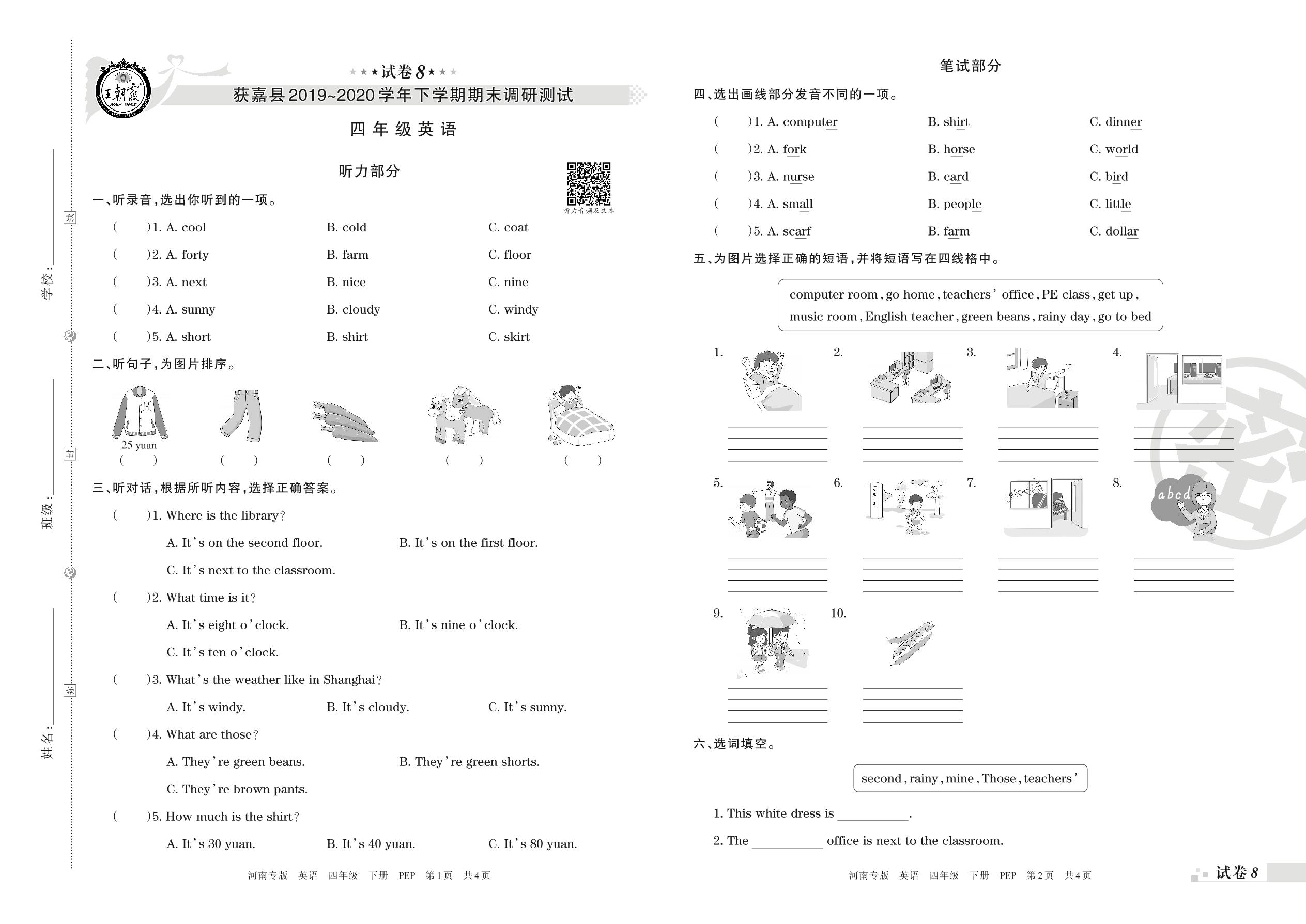 2019-2020学年第二学期新乡市获嘉县四年级英语试卷(PEP版)【8】