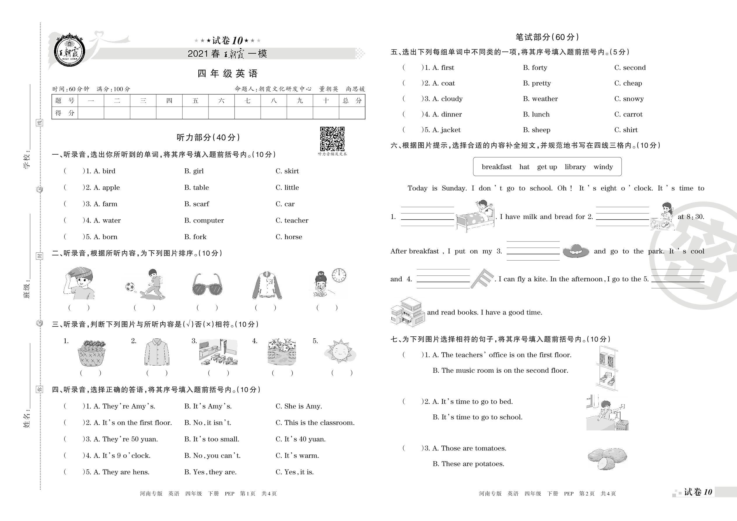 王朝霞期末模拟卷四年级下册英语(PEP版)_R21080784606【10】