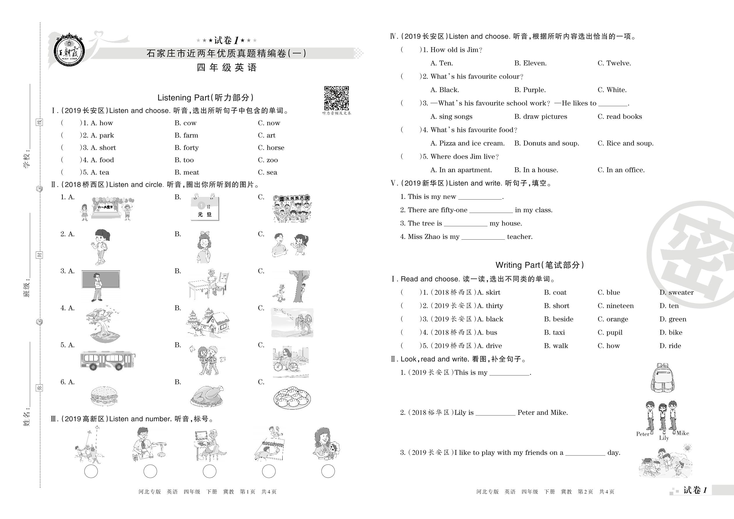石家庄市近两年优质真题精编卷(一)四年级下册英语(冀教版)【1】