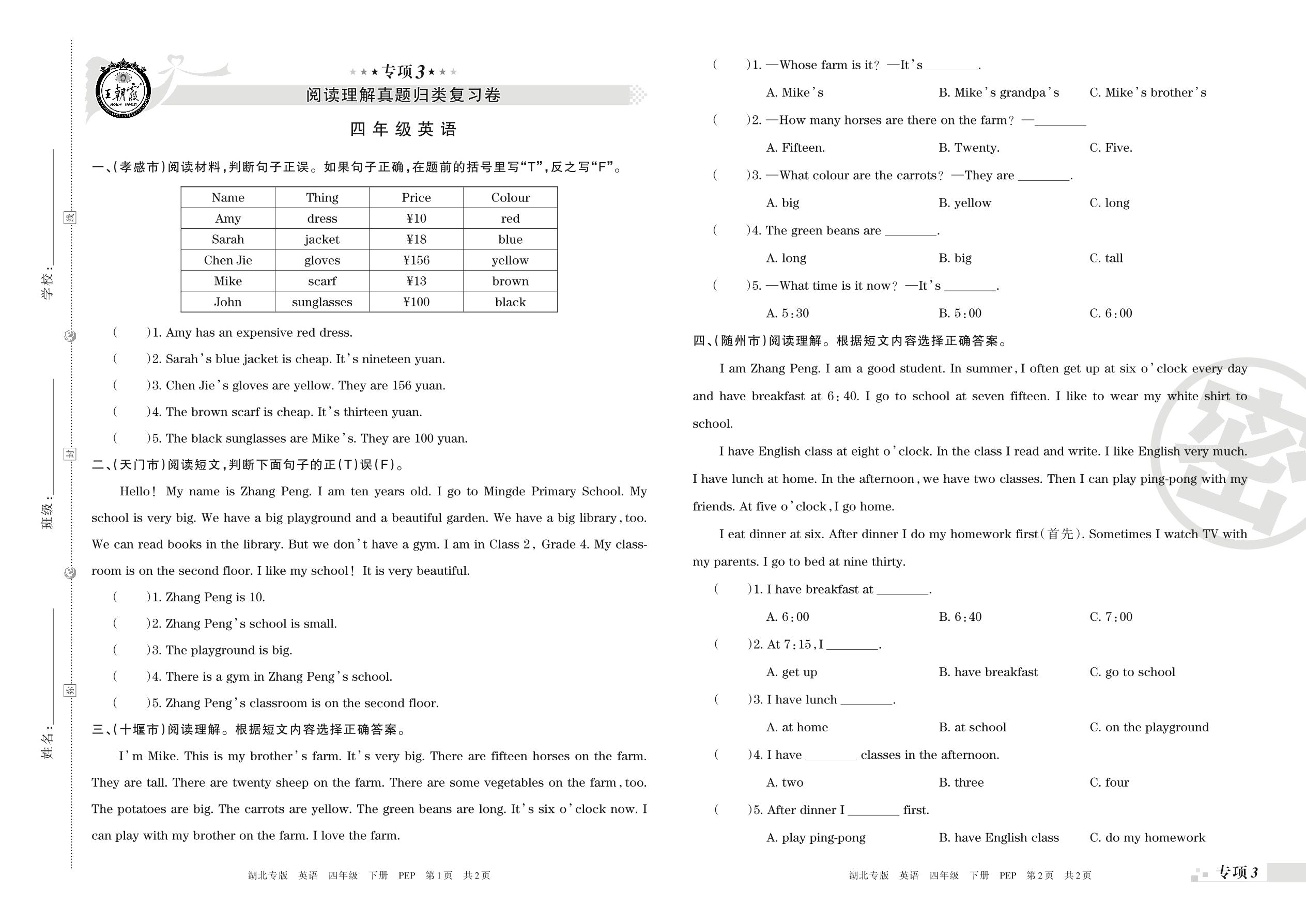 王朝霞期末专项卷——阅读理解真题归类复习、补全短文四年级下册英语(PEP版)_R21080784803【0】