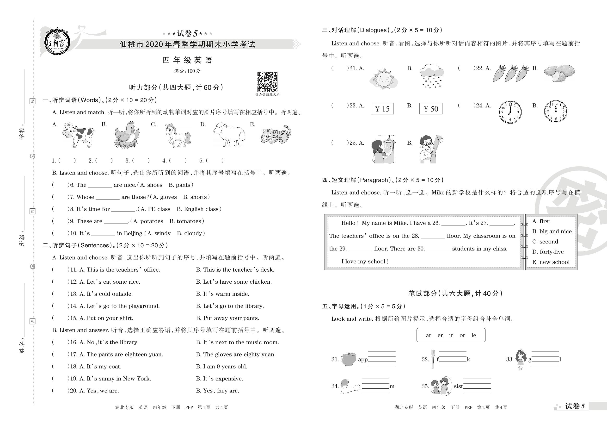 2019-2020学年第二学期仙桃市四年级英语试卷(PEP版)【5】