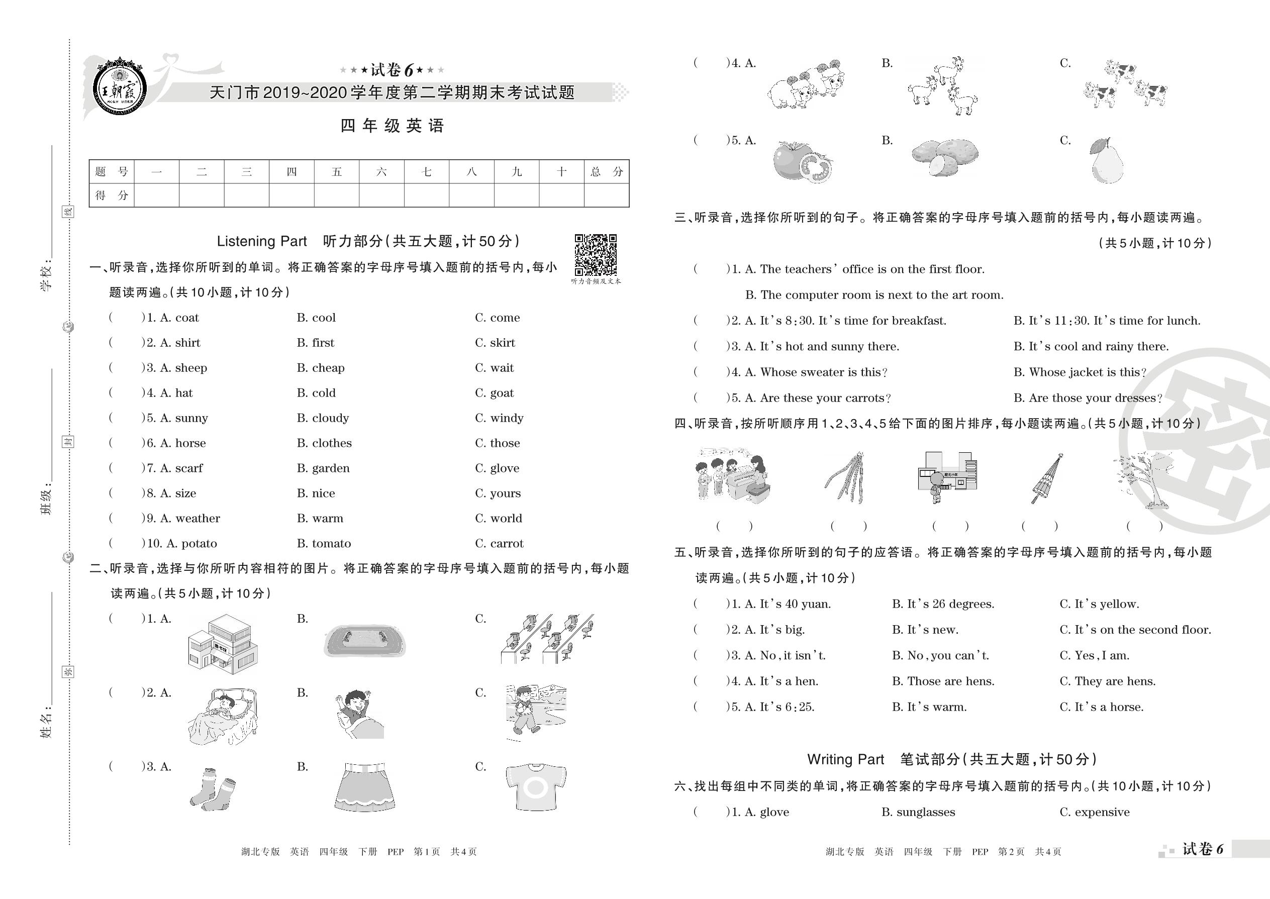 2019-2020学年第二学期天门市四年级英语试卷(PEP版)【6】