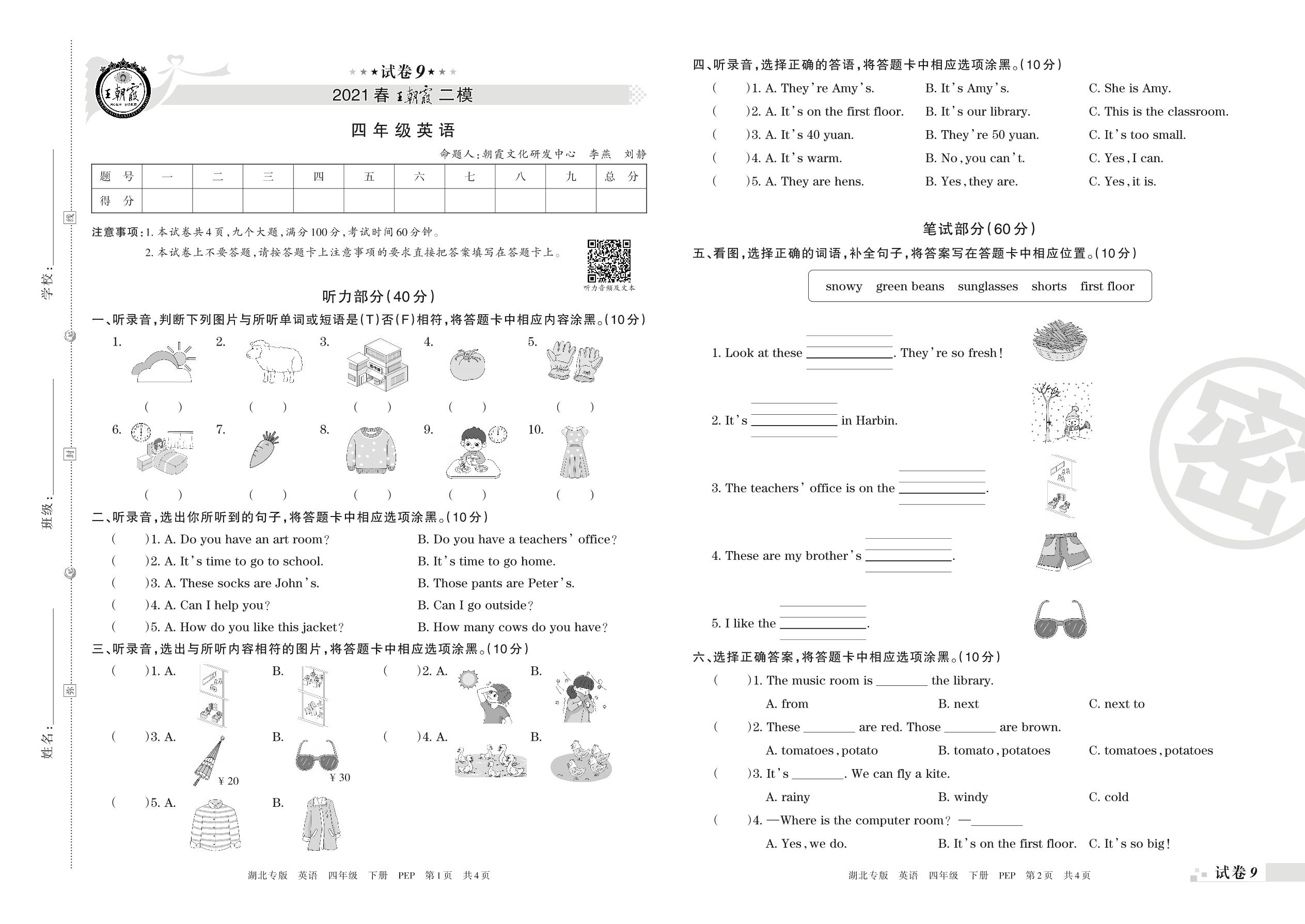 王朝霞期末模拟卷四年级下册英语(PEP版)_R21080784851【9】