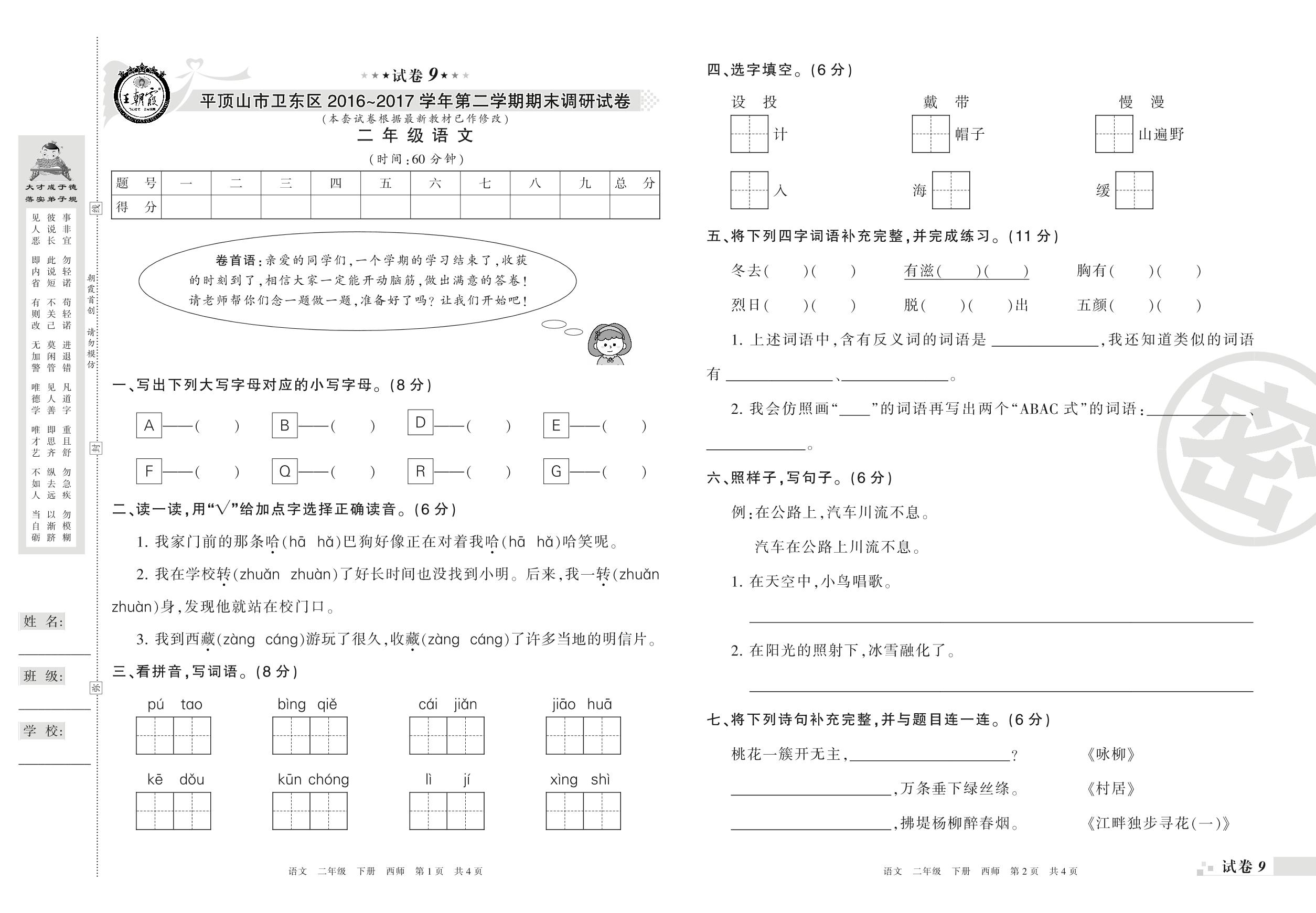 2016-2017学年第二学期平顶山市卫东区二年级语文试卷(西师版)【9】