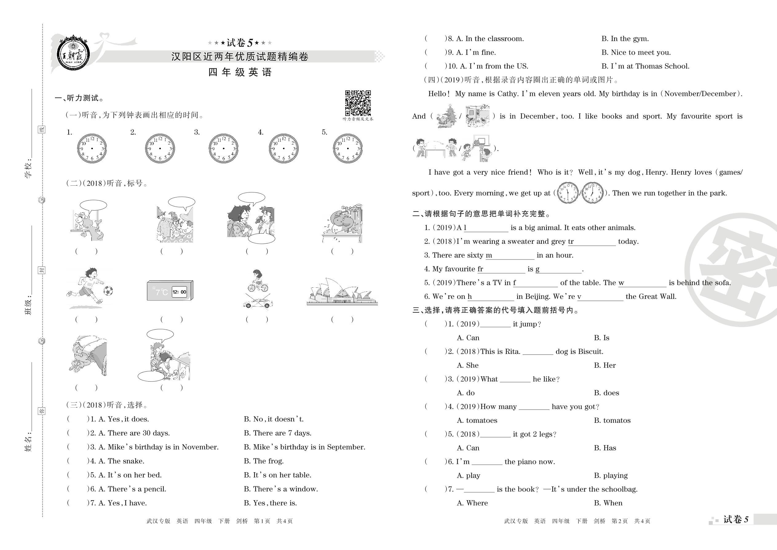 武汉市汉阳区近两年优质试题精编卷四年级英语试卷(剑桥版)【5】