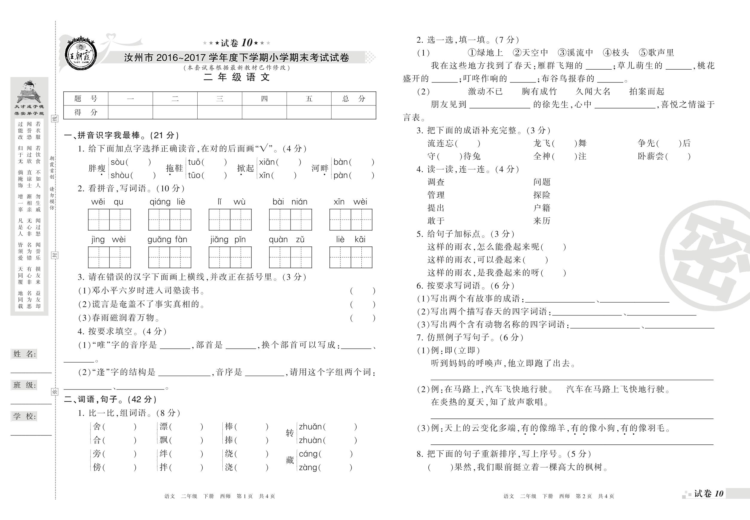 2016-2017学年第二学期汝州市二年级语文试卷(西师版)【10】