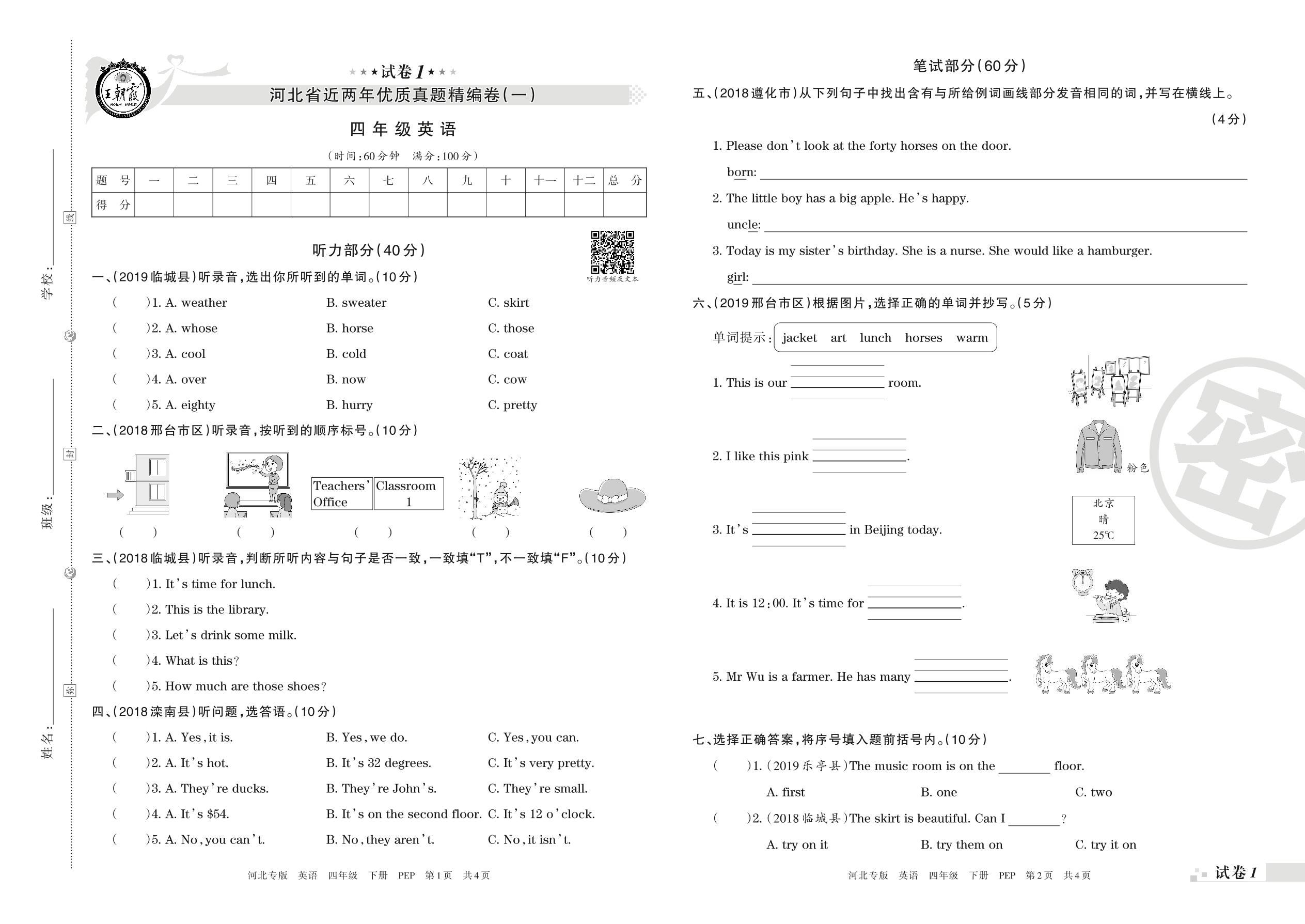 真题精编卷(一)四年级下册英语(PEP版)【1】