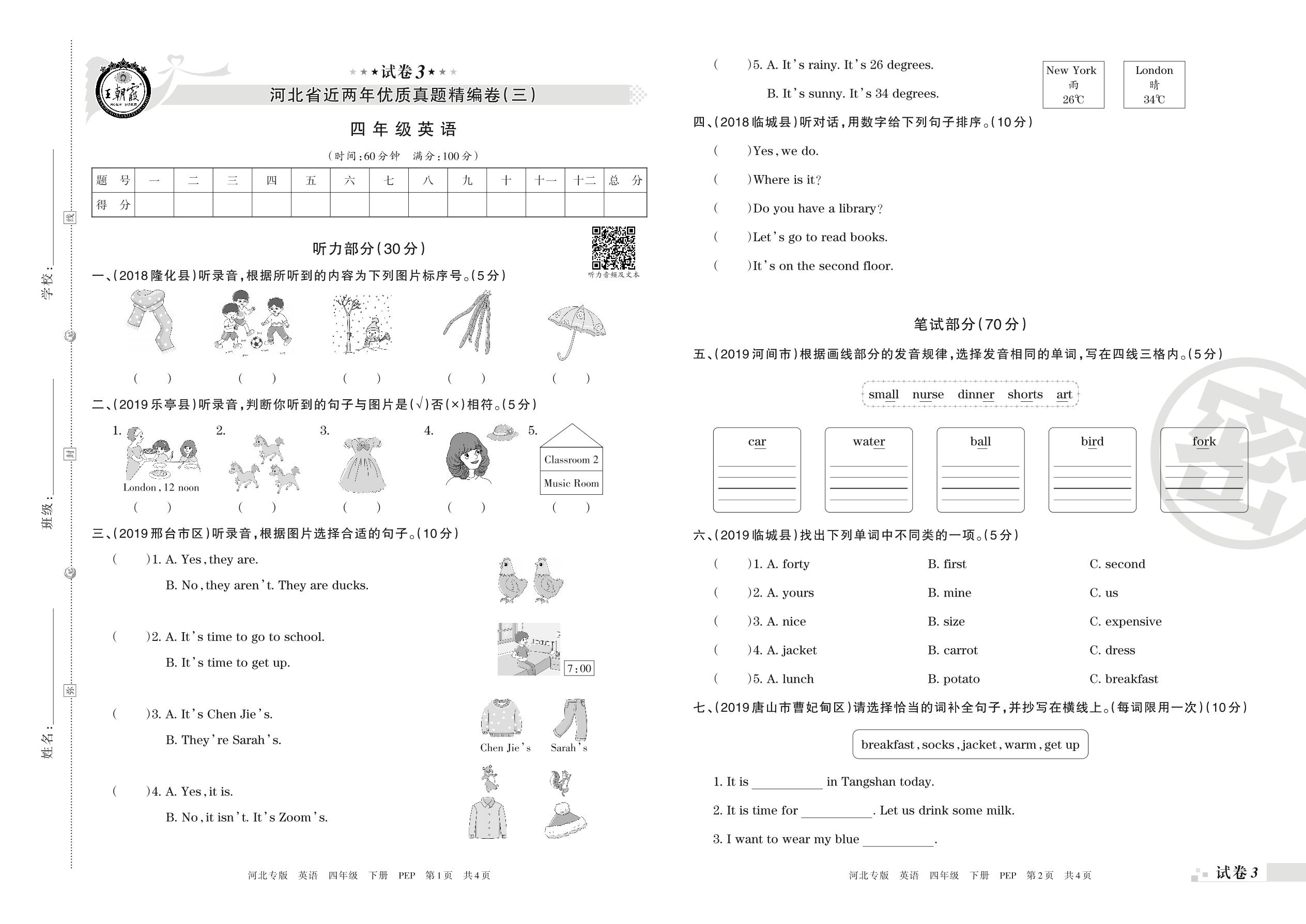 真题精编卷(三)四年级下册英语(PEP版)【3】