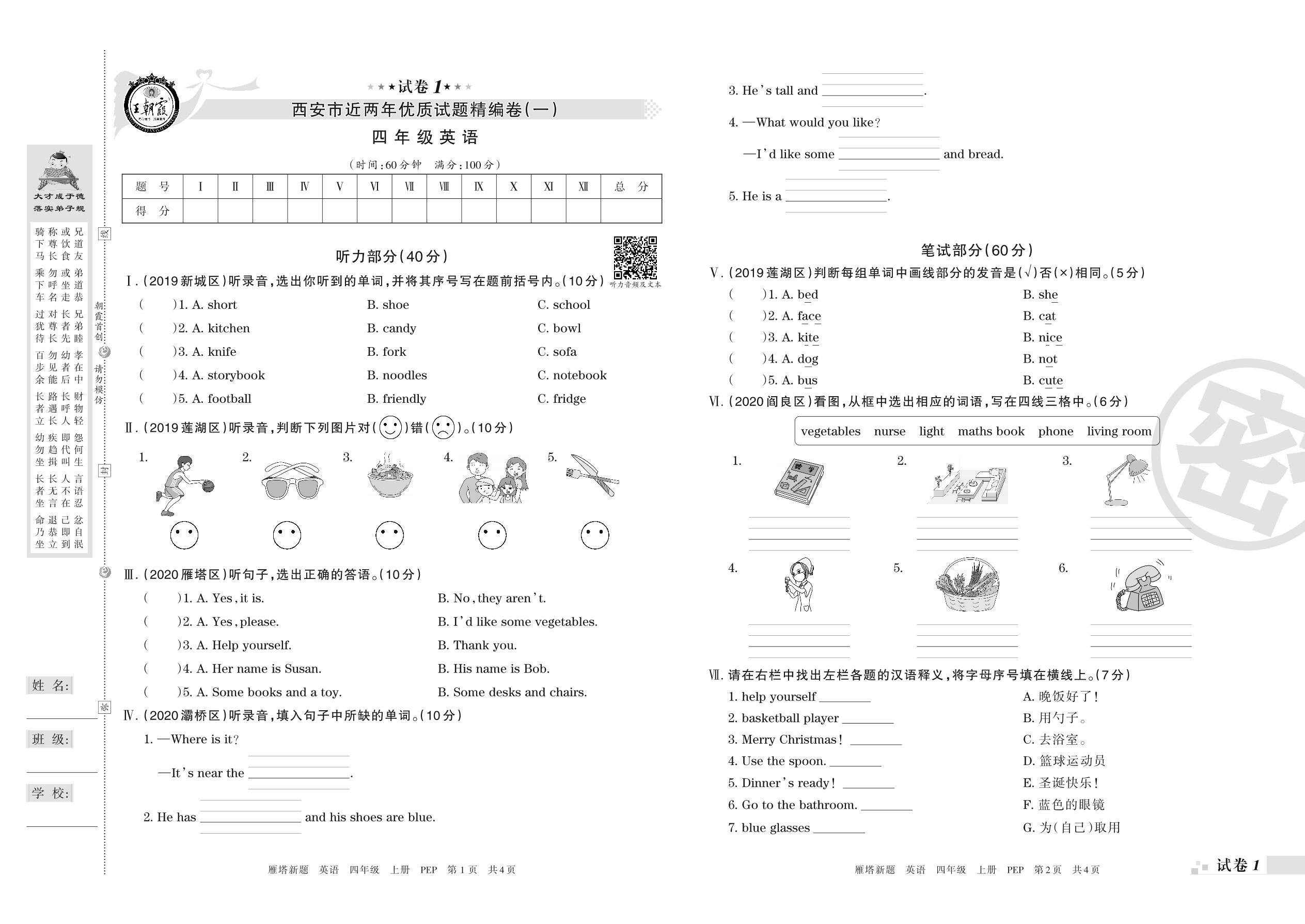 西安市近两年优质试题精编卷(一)四年级上册英语(PEP版)【1】