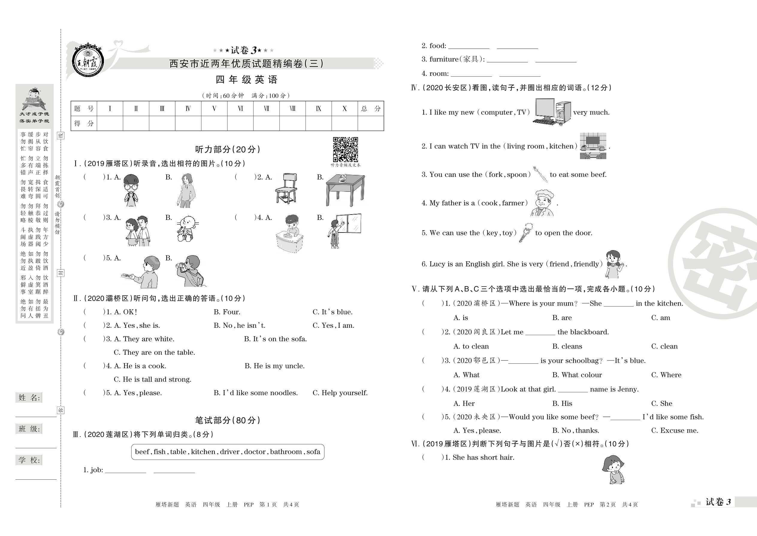 西安市近两年优质试题精编卷(三)四年级上册英语(PEP版)【3】