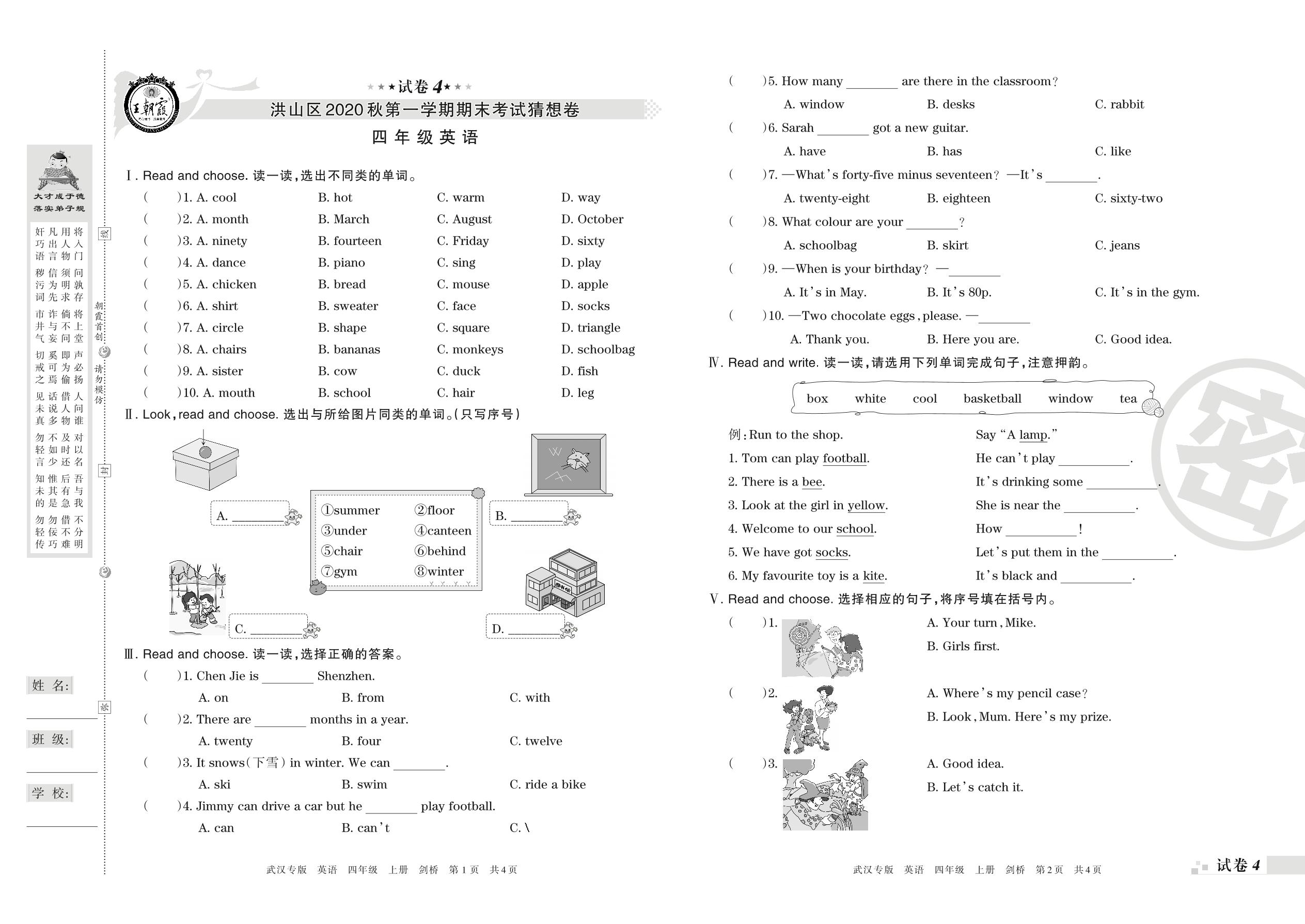 2019-2020学年第一学期武汉市洪山区四年级英语试卷(剑桥版)【4】