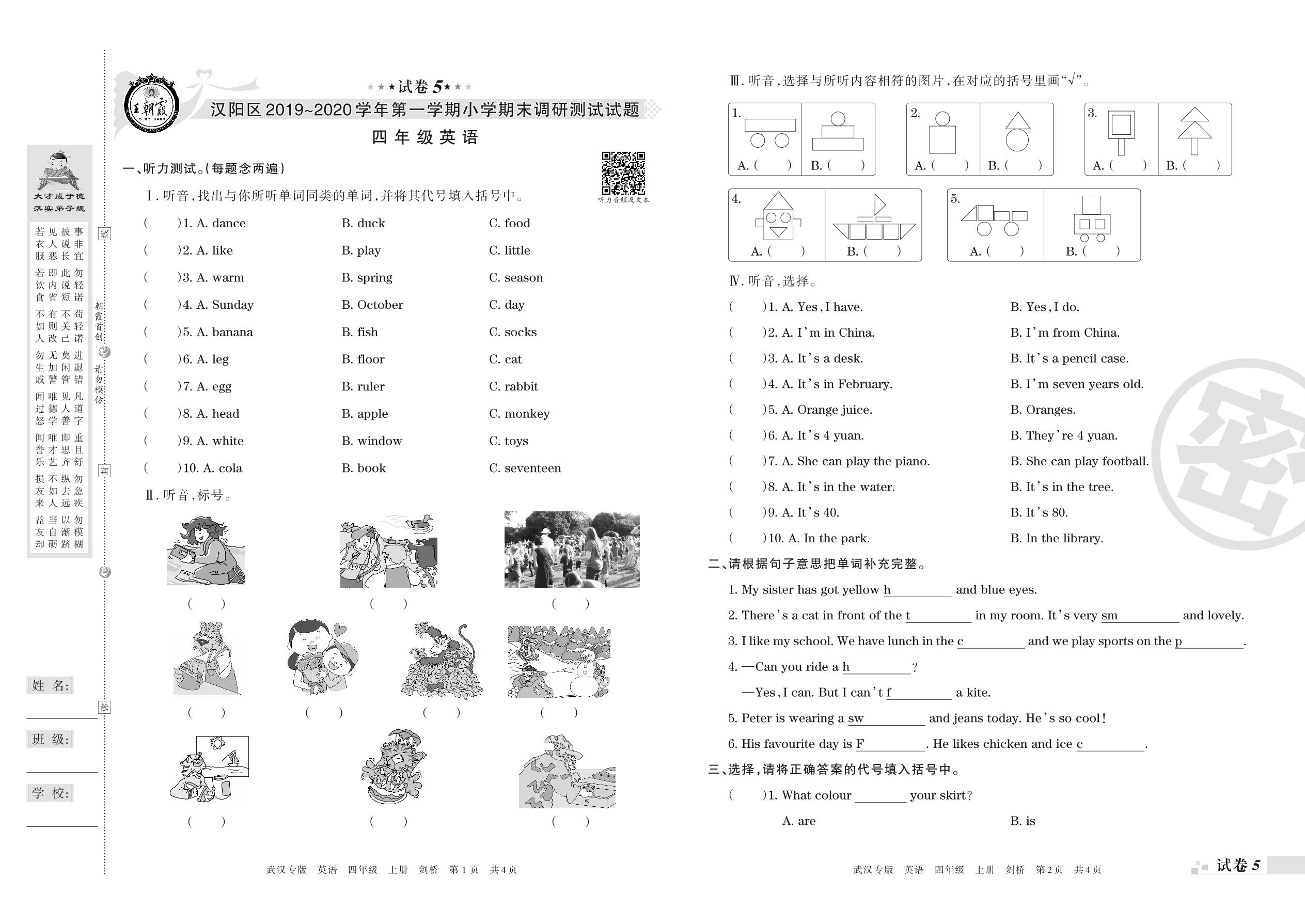 2019-2020学年第一学期武汉市汉阳区四年级英语试卷(剑桥版)【5】