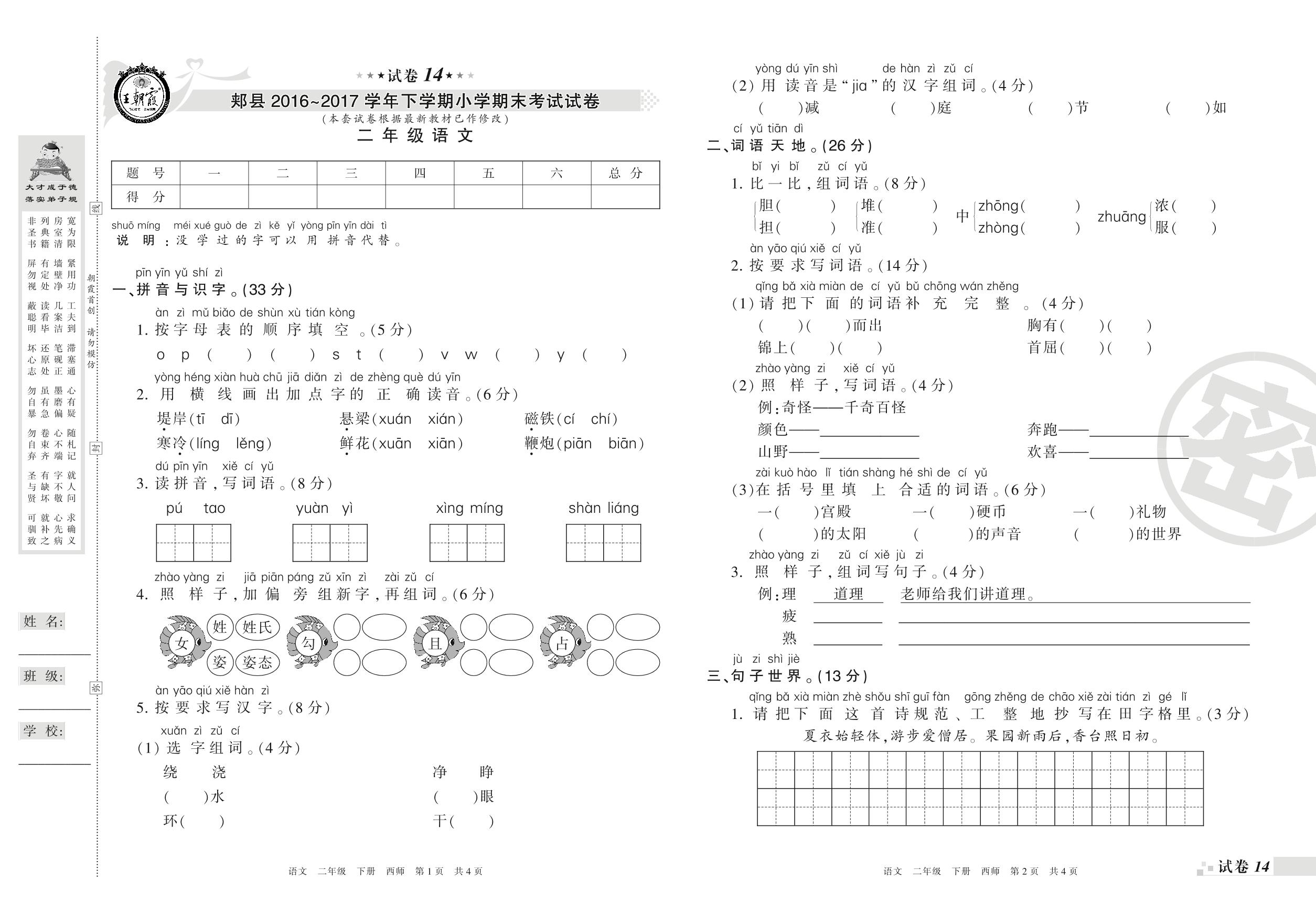 2016-2017学年第二学期平顶山市郏县二年级语文试卷(西师版)【14】