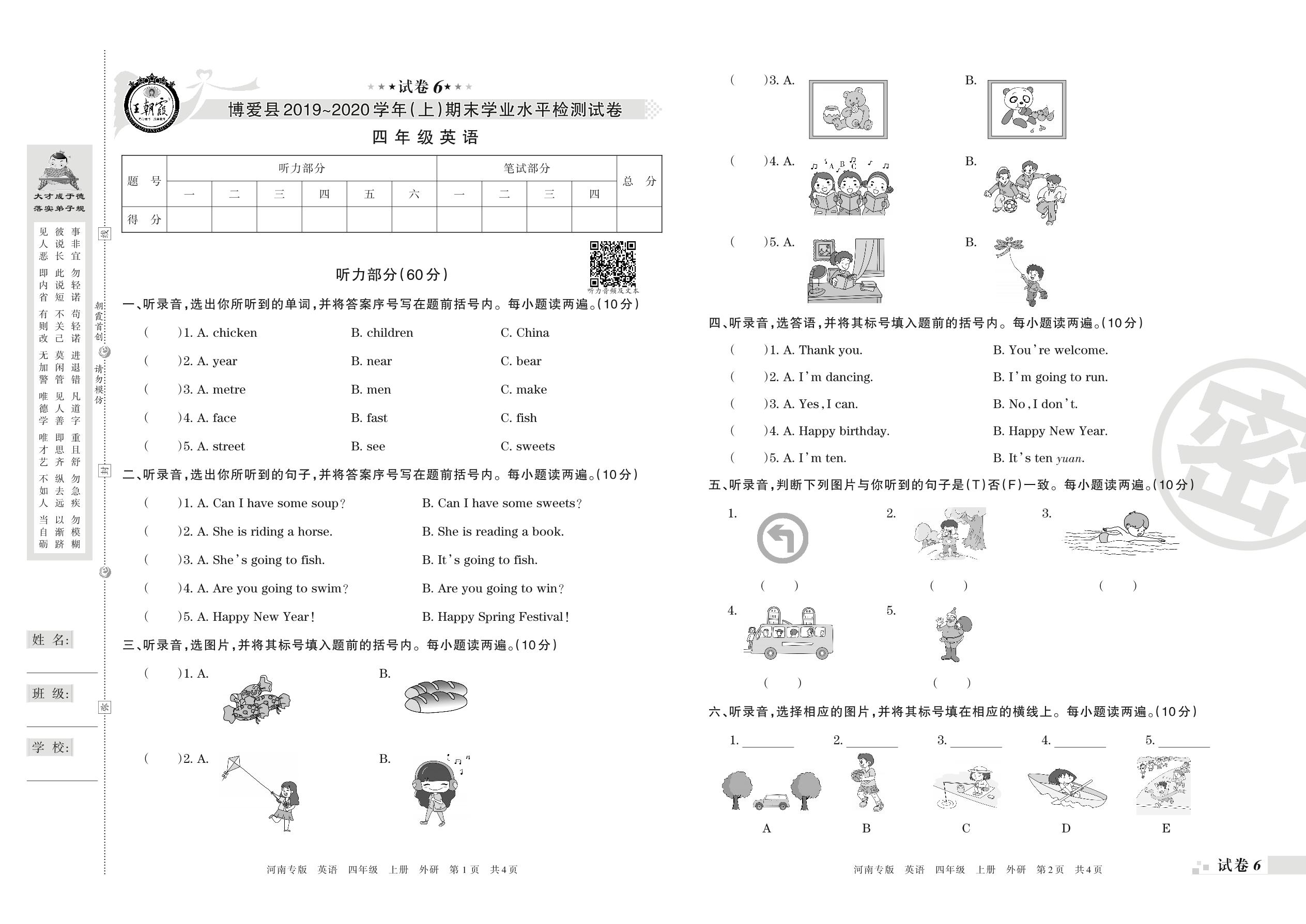 2019-2020学年第一学期焦作市博爱县四年级英语试卷(外研版)【6】