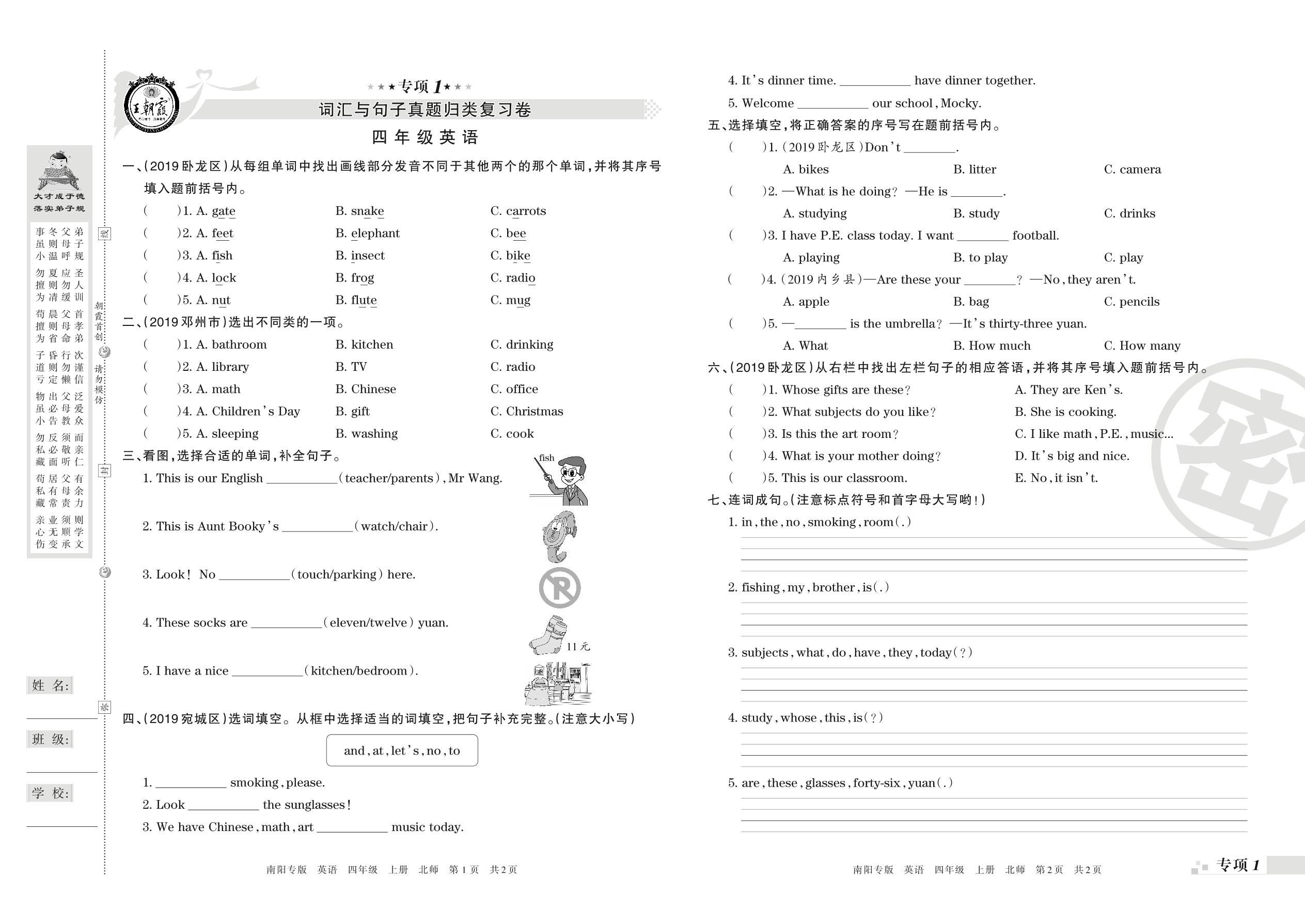 王朝霞期末专项卷——词汇与句子、情景交际真题归类复习四年级上册英语(北师版)