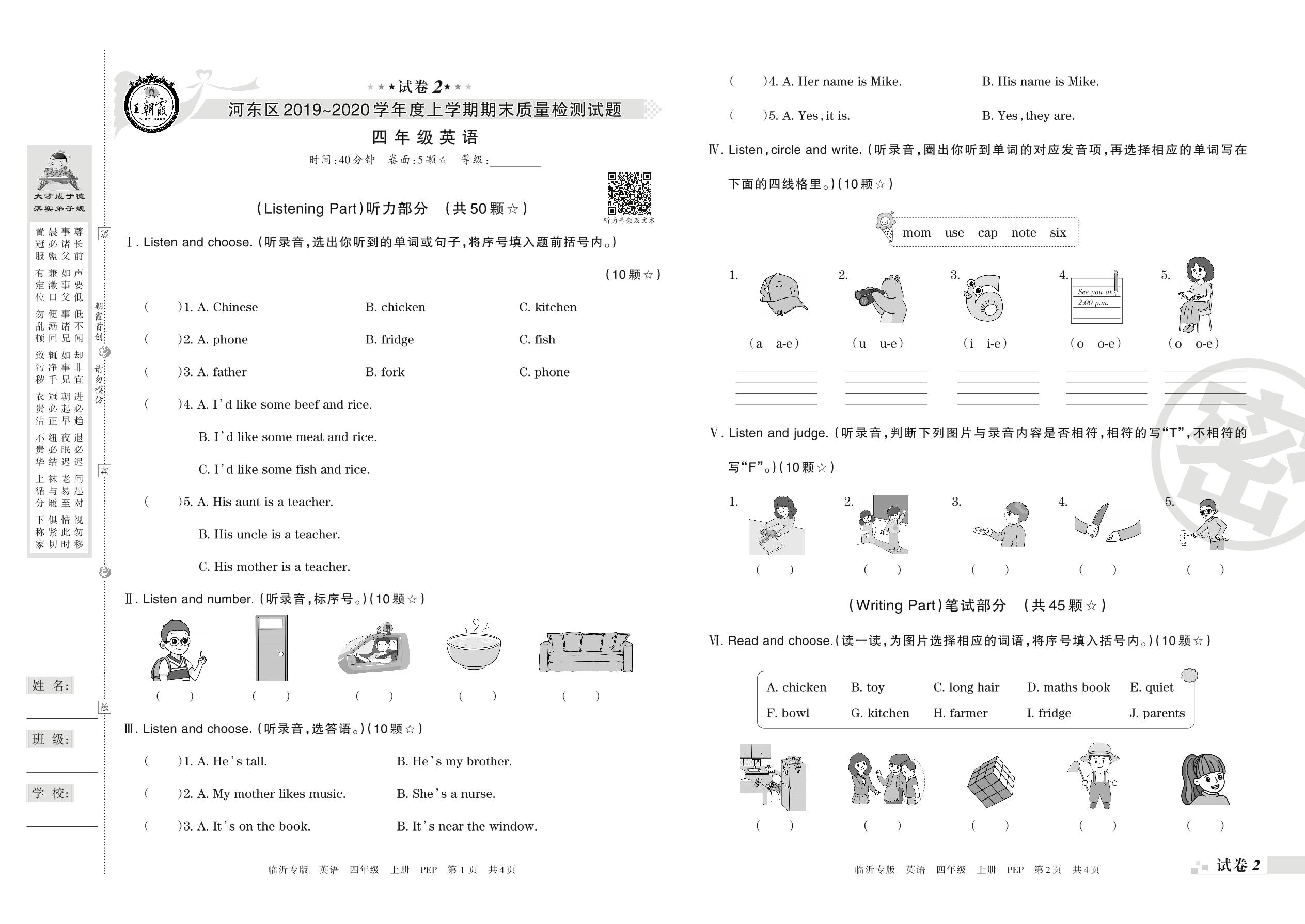 2019-2020学年第一学期临沂市河东区四年级英语试卷(PEP版)【2】