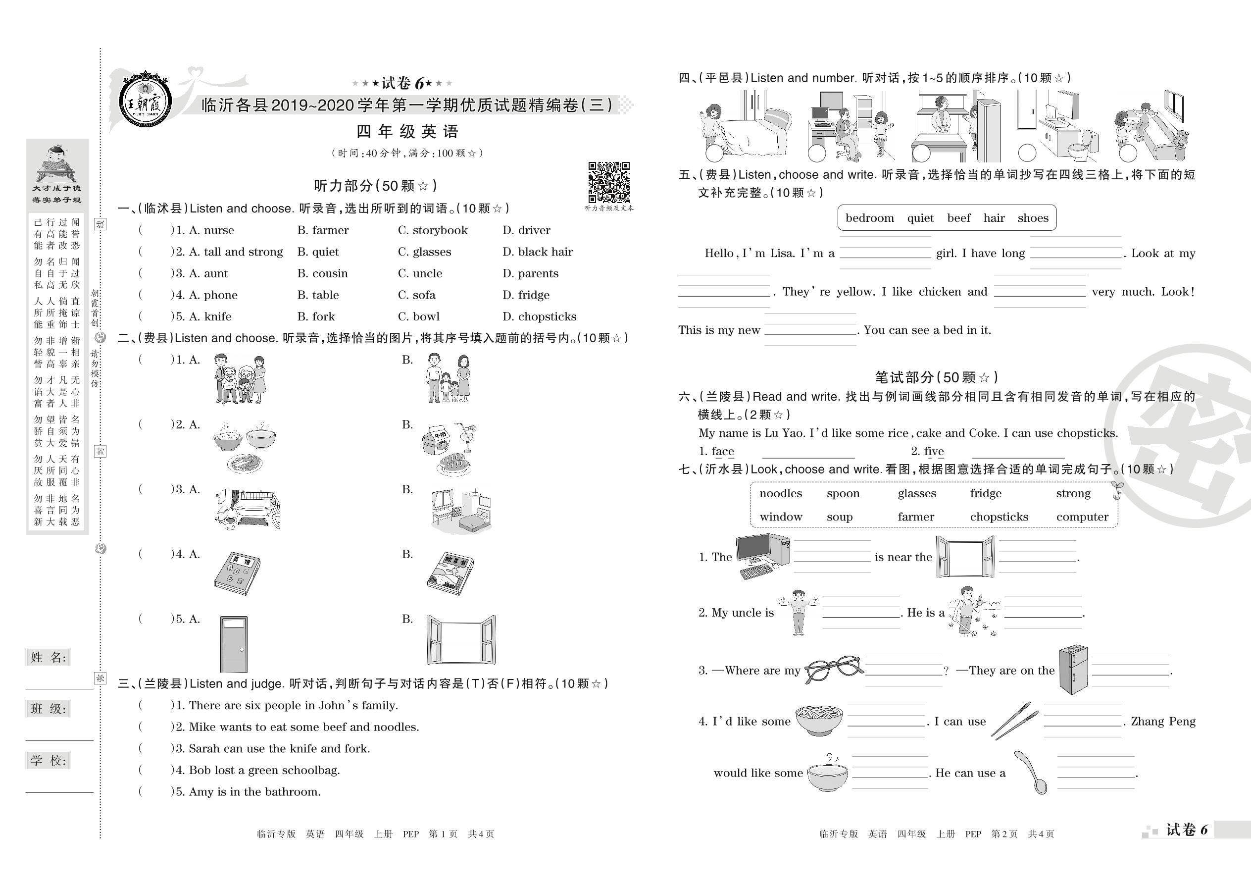 2019-2020学年第一学期临沂市各县优质试题精编卷(三)四年级英语试卷(PEP版)【6】