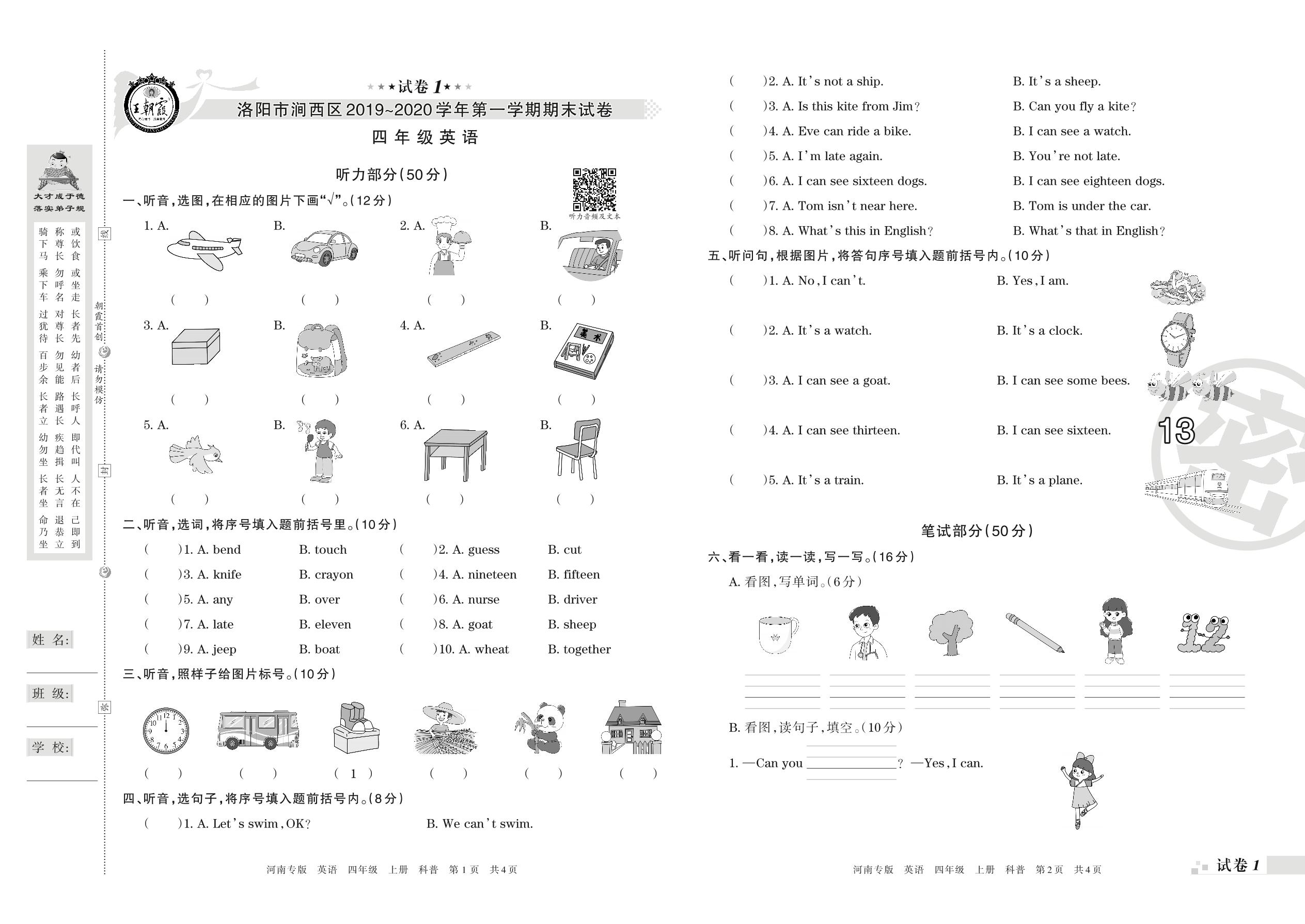 2019-2020学年第一学期洛阳市涧西区四年级英语试卷(科普版)【1】