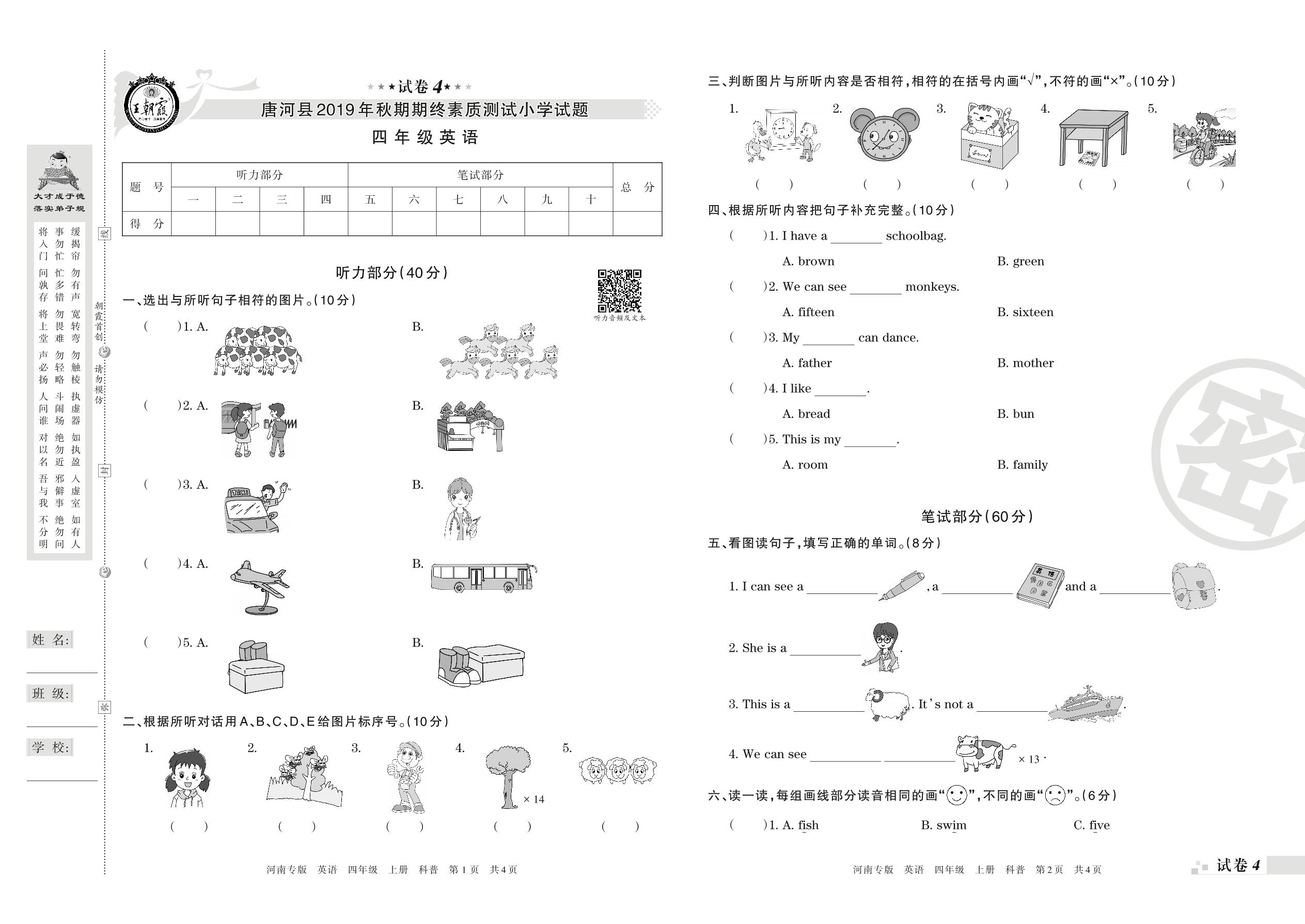 2019-2020学年第一学期南阳市唐河县四年级英语试卷(科普版)【4】
