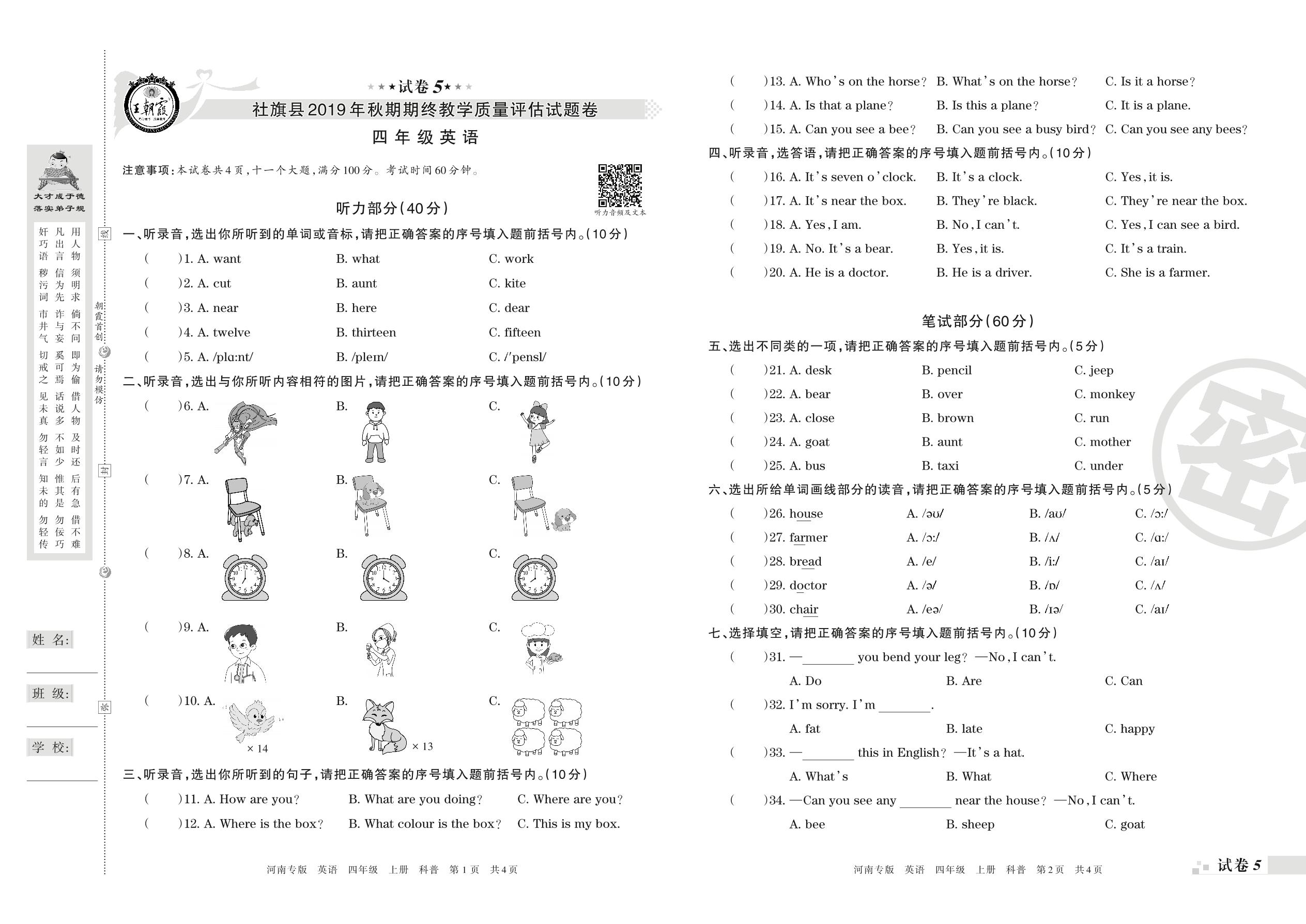 2019-2020学年第一学期南阳市社旗县四年级英语试卷(科普版)【5】