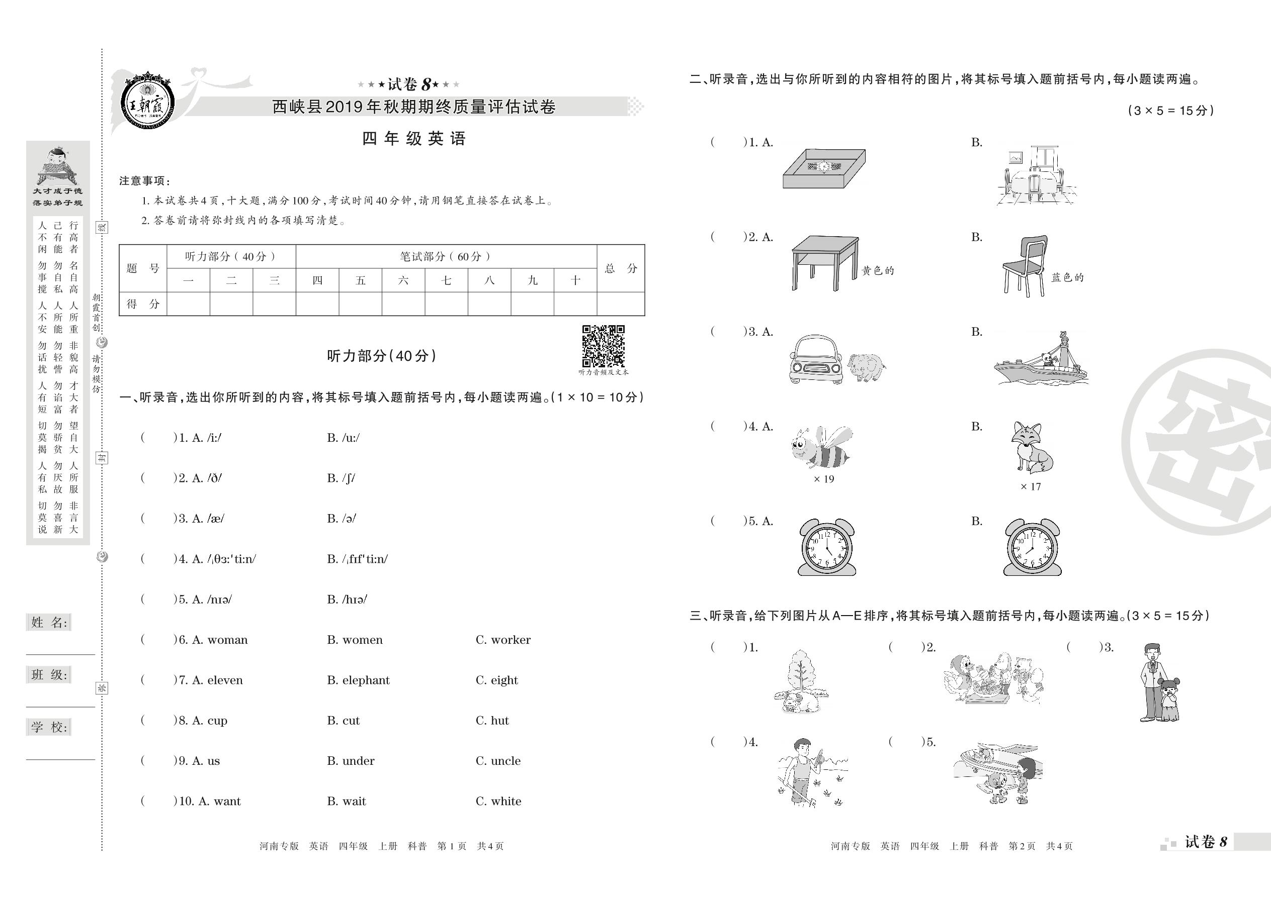 2019-2020学年第一学期南阳市西峡县四年级英语试卷(科普版)【8】