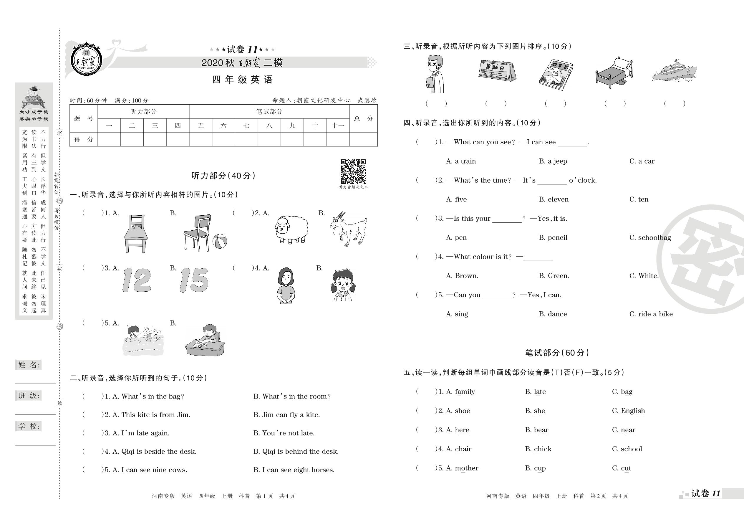 王朝霞期末模拟卷四年级上册英语(科普版)【11】