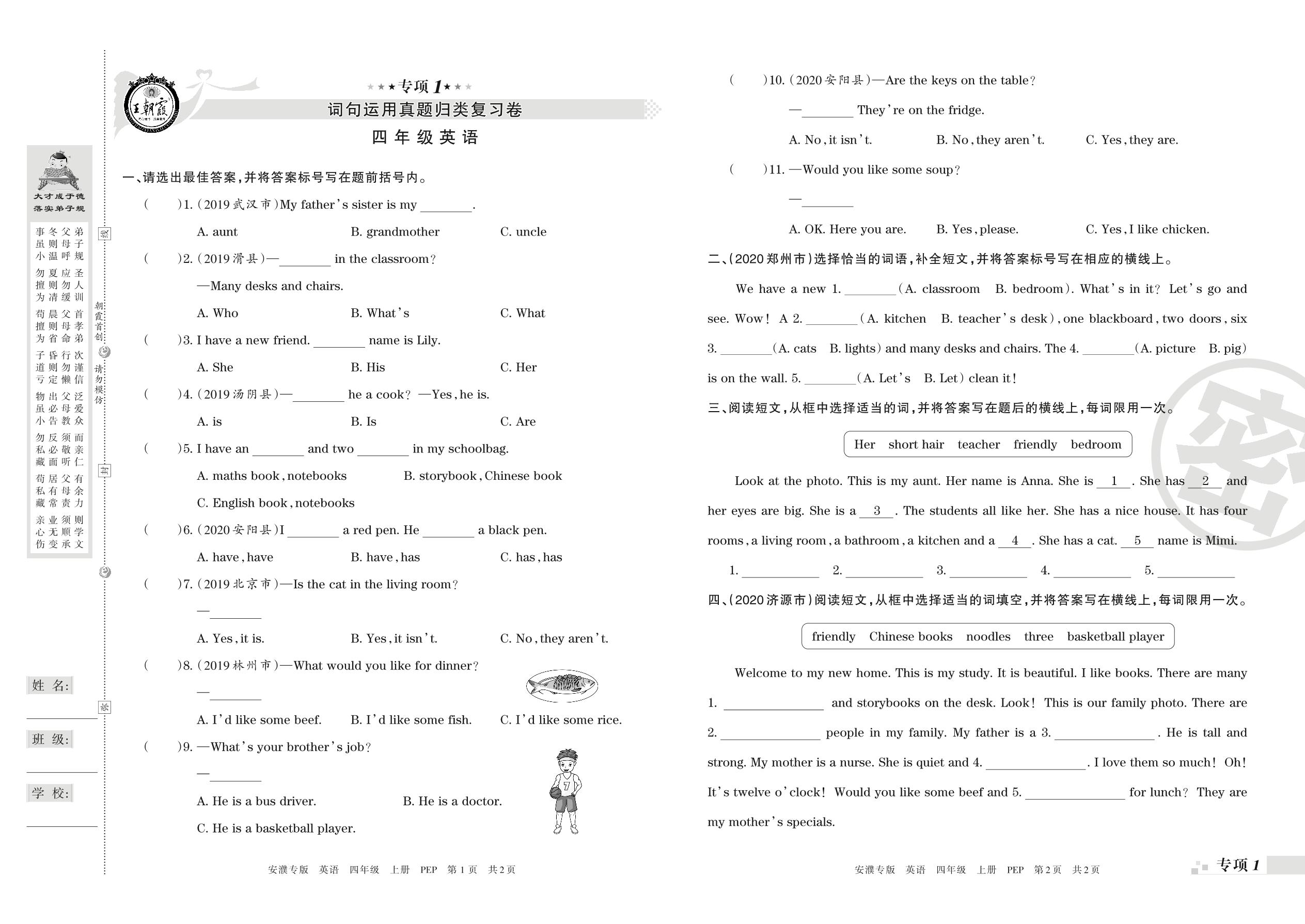 四年级英语人教PEP版(三起始)上册专项卷