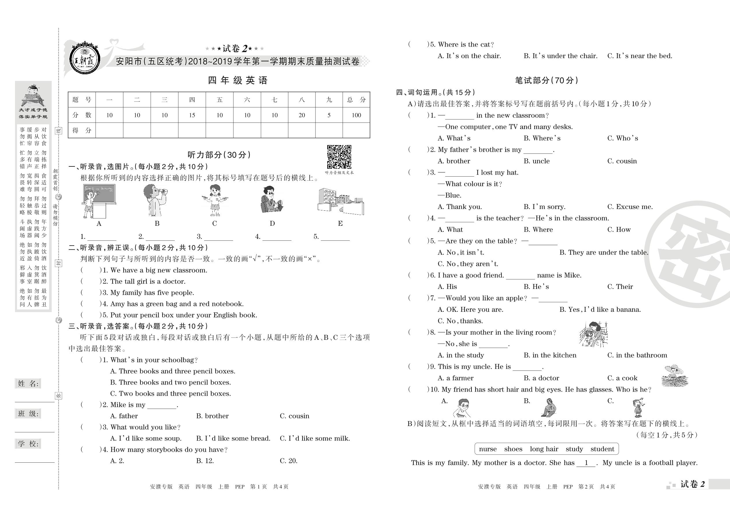 2019-2020学年第一学期安阳市(五区统考)四年级英语试卷(PEP版)【2】