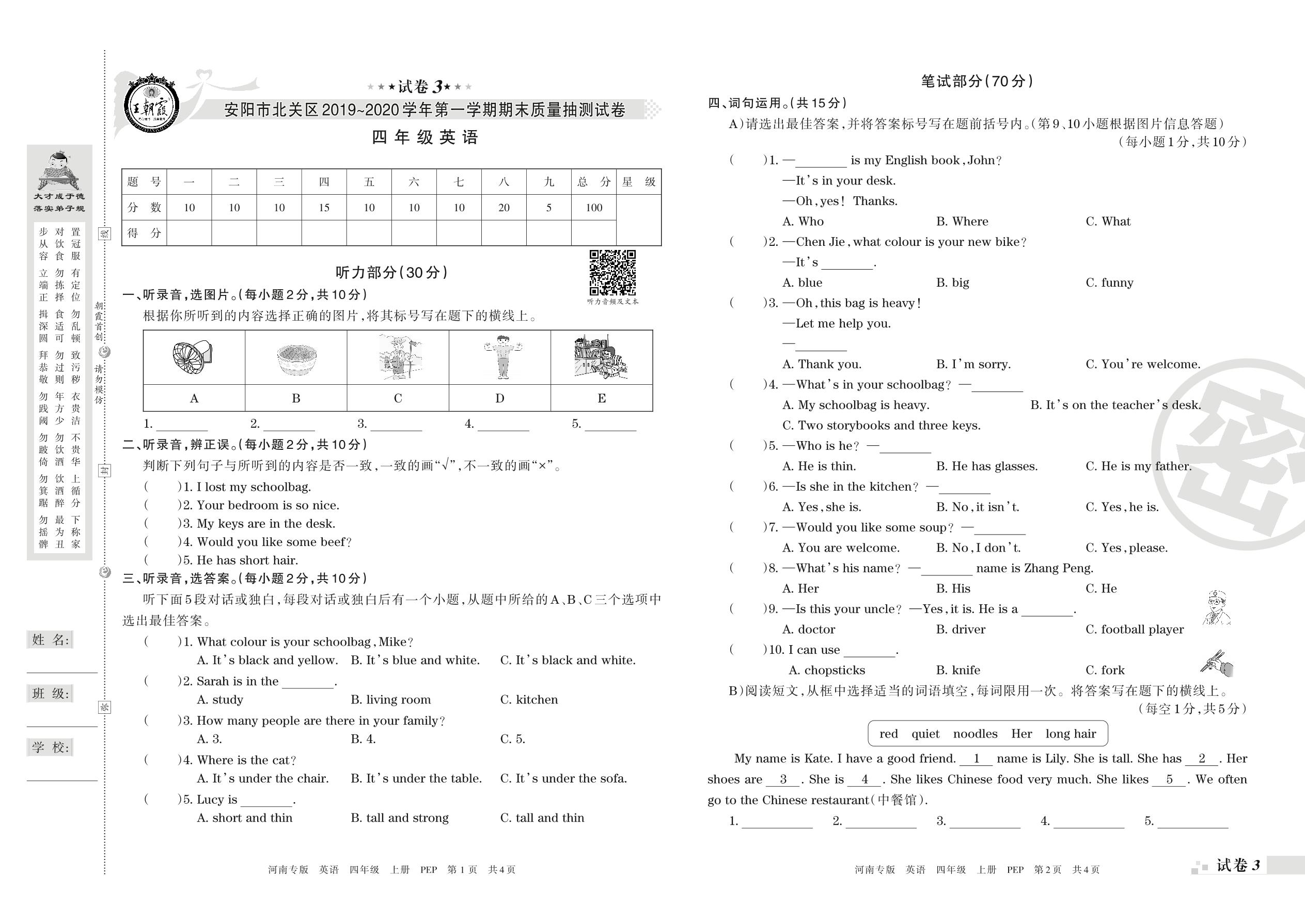 2019-2020学年第一学期安阳市北关区四年级英语试卷(PEP版)【3】