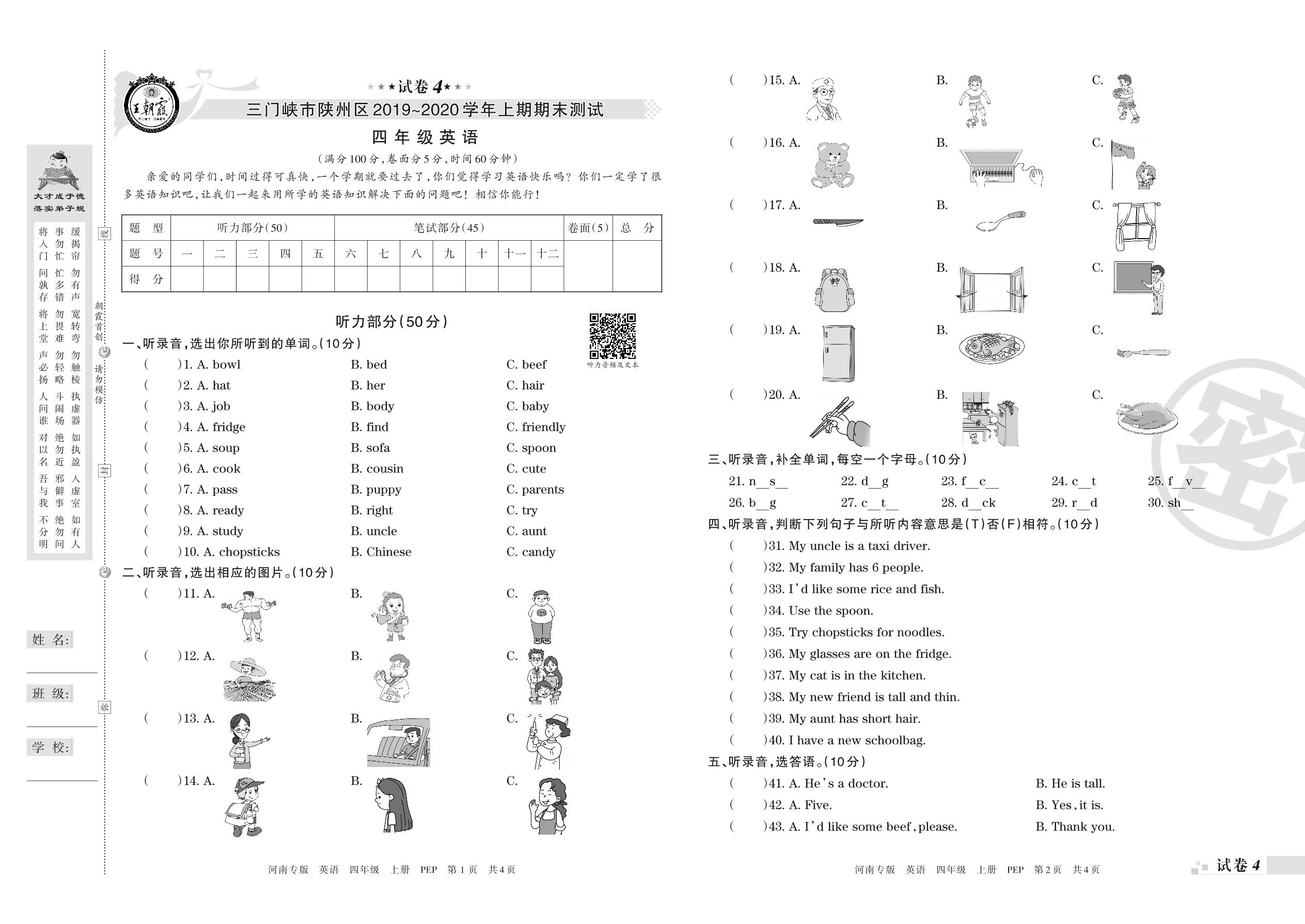 2019-2020学年第一学期三门峡市陕州区四年级英语试卷(PEP版)【4】