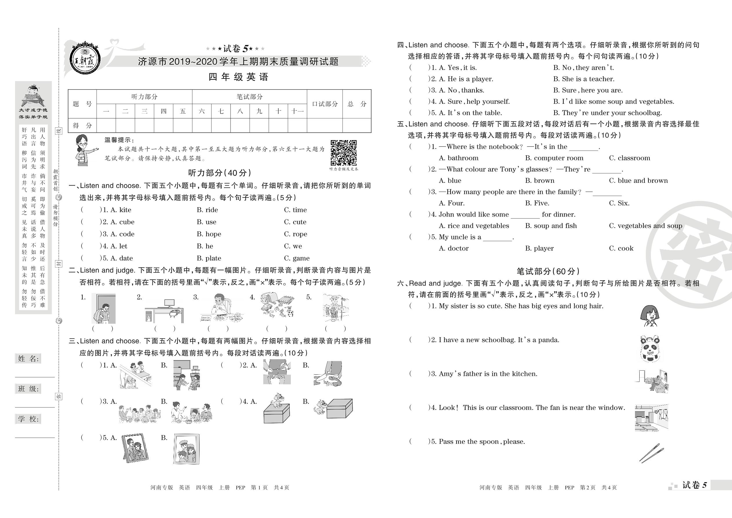 2019-2020学年第一学期济源市四年级英语试卷(PEP版)【5】