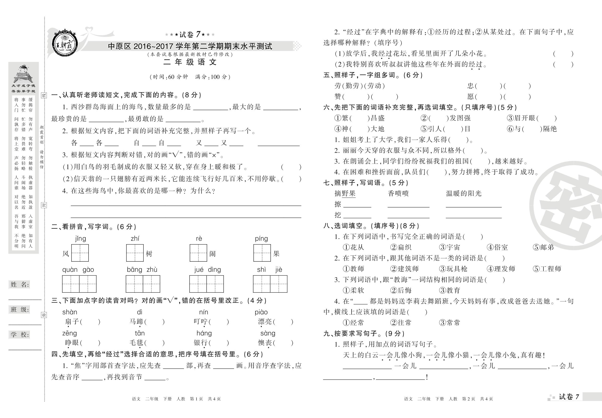 2016-2017学年第二学期郑州市中原区二年级语文试卷(人教版)【7】