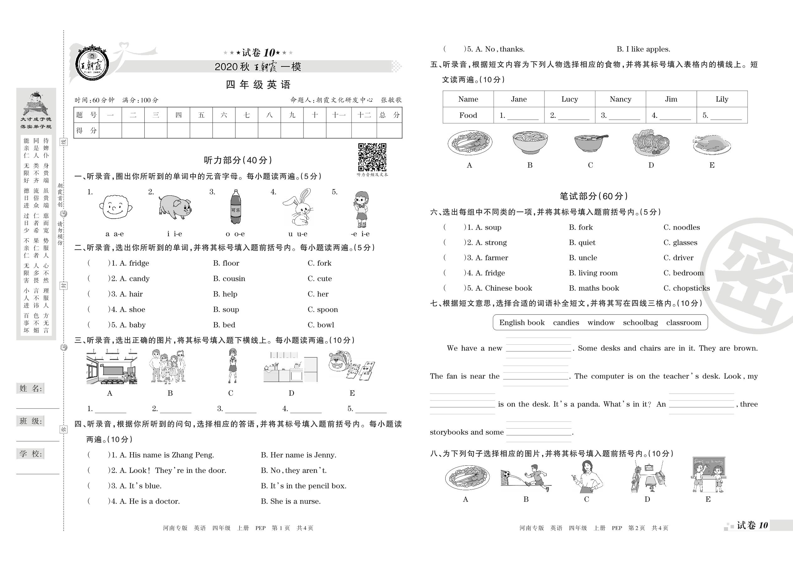 王朝霞期末模拟卷四年级上册英语(PEP版)_R21080790003【10】