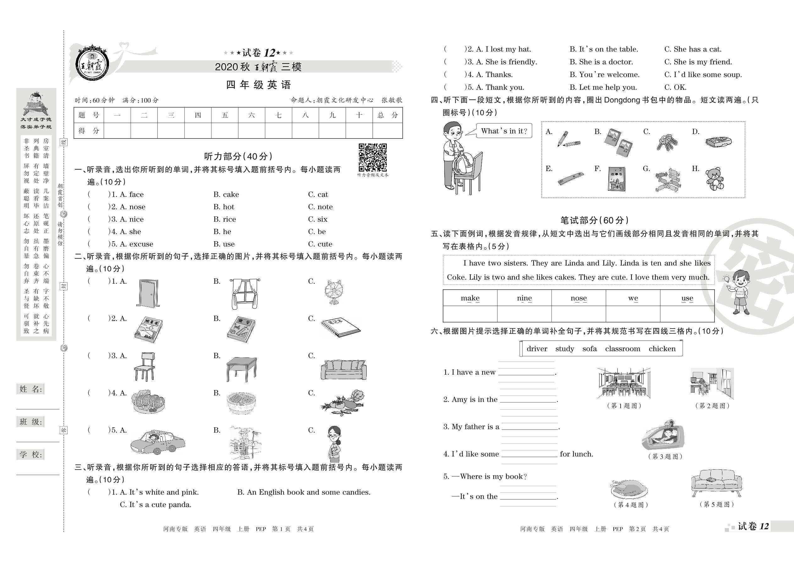 王朝霞期末模拟卷四年级上册英语(PEP版)_R21080790017【12】