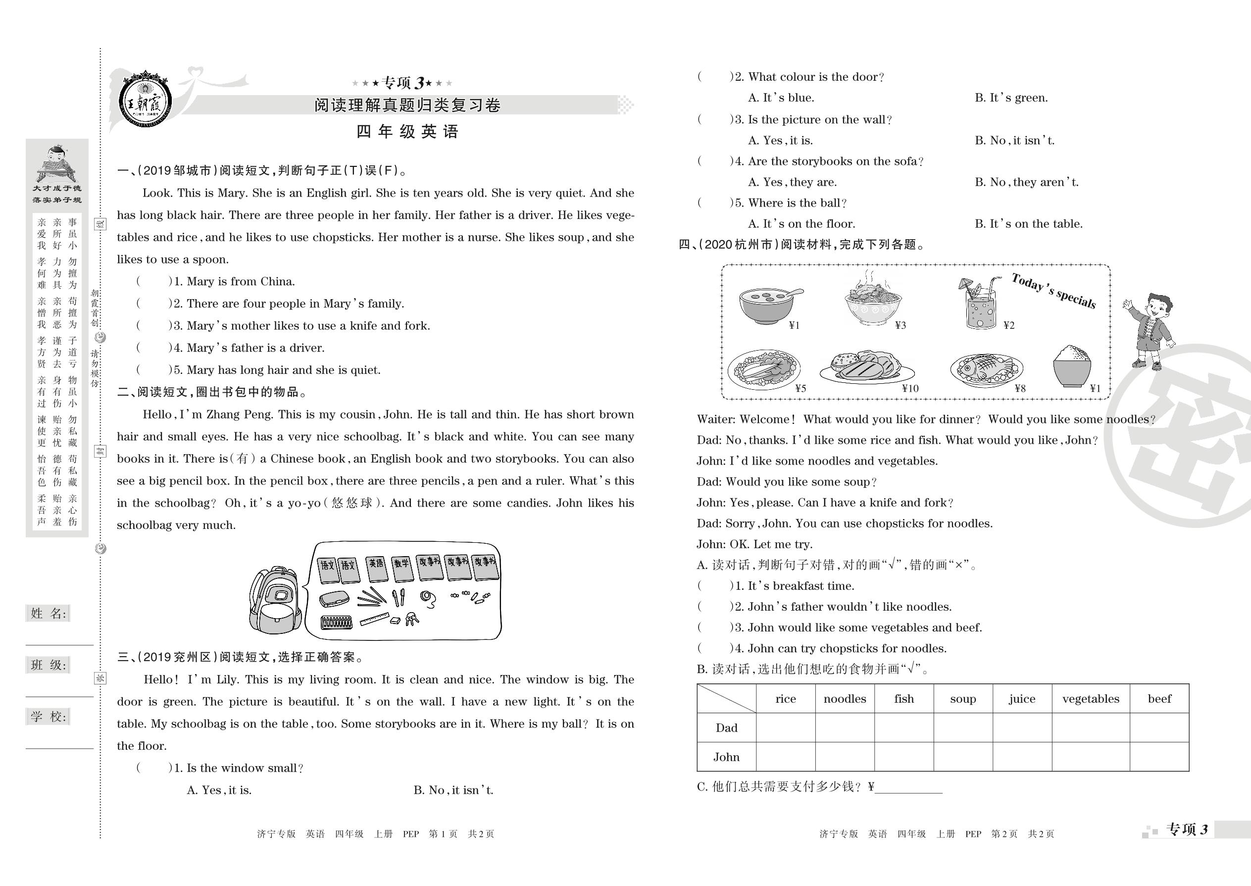 王朝霞期末专项卷——阅读理解真题归类复习、绘本阅读四年级上册英语(PEP版)_R21080790044【0】
