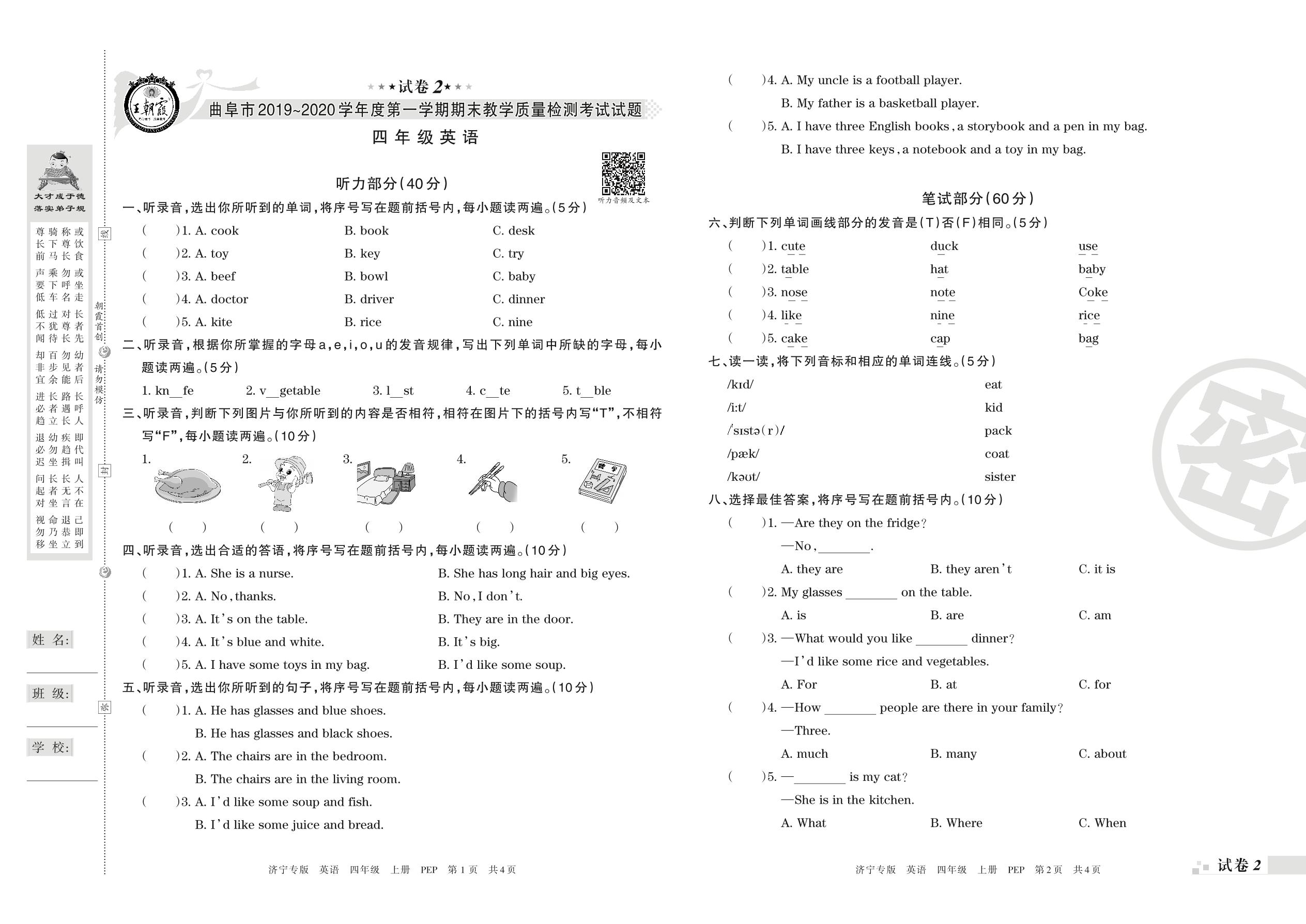 2019-2020学年第一学期曲阜市四年级英语试卷(PEP版)【2】