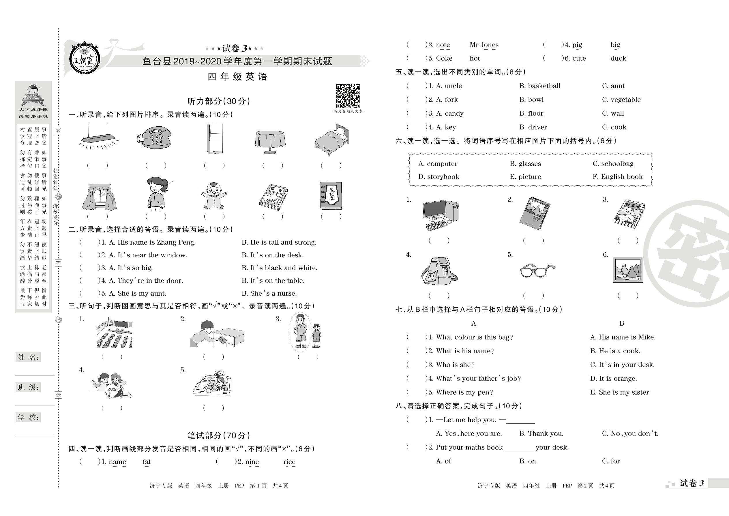 2019-2020学年第一学期济宁市鱼台县四年级英语试卷(PEP版)【3】