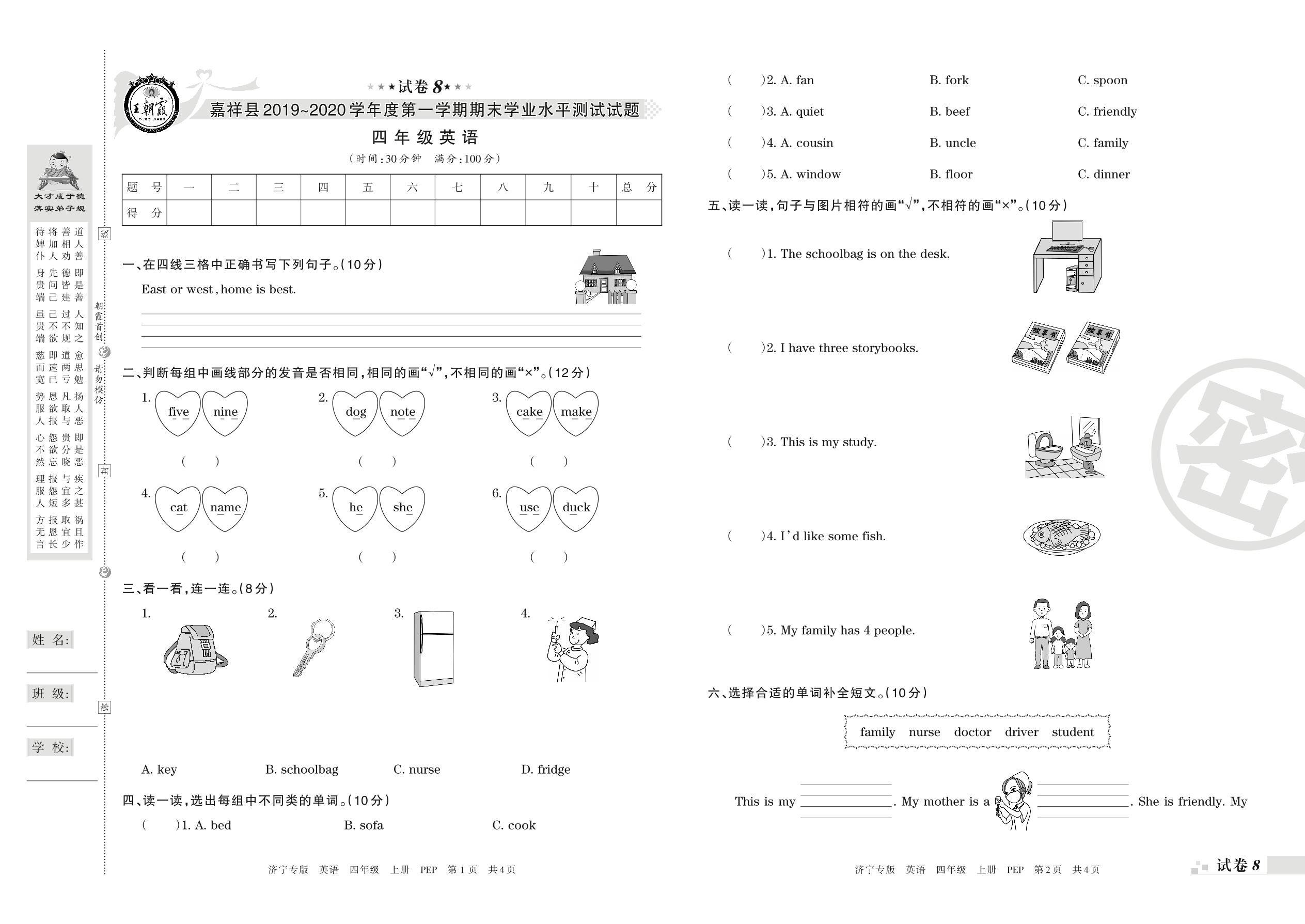 2019-2020学年第一学期济宁市嘉祥县四年级英语试卷(PEP版)【8】
