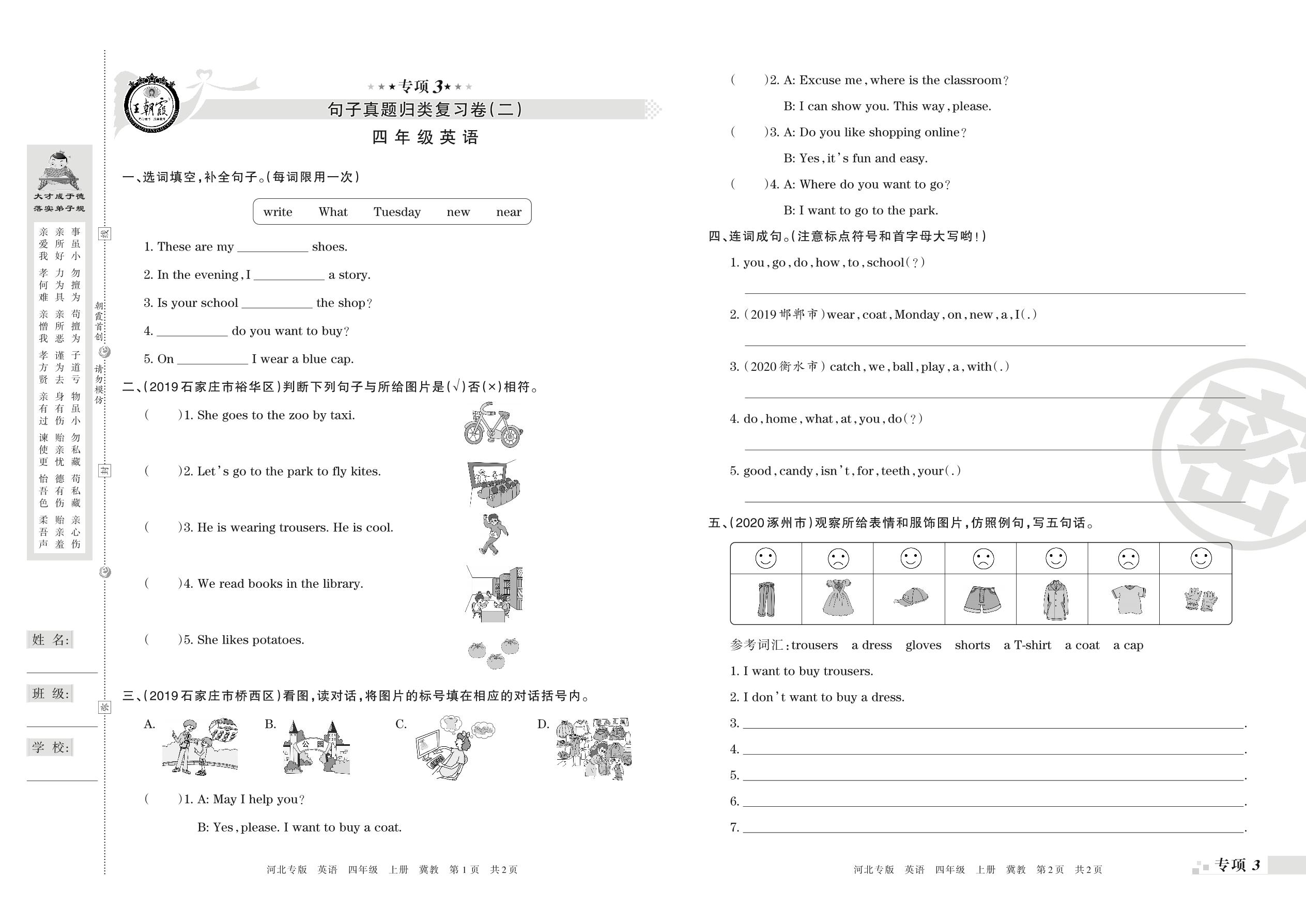 王朝霞期末专项卷——句子、情景交际真题归类复习四年级上册英语(冀教版)【0】