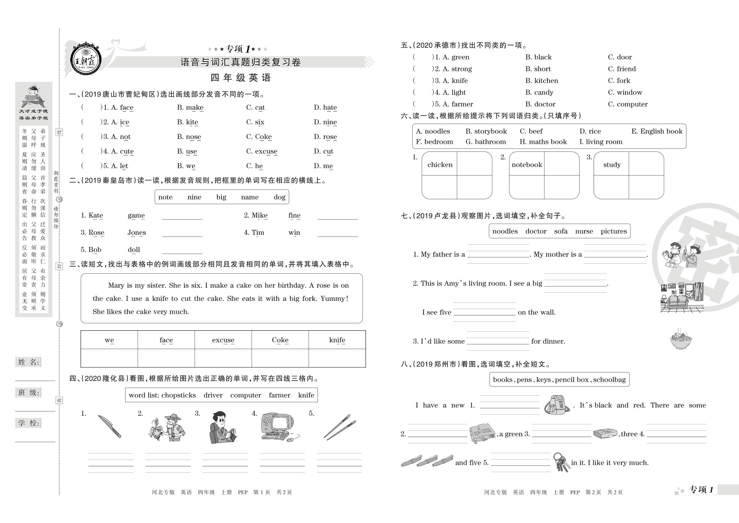 王朝霞期末专项卷——语音与词汇、句子真题归类复习四年级上册英语(PEP版)【0】