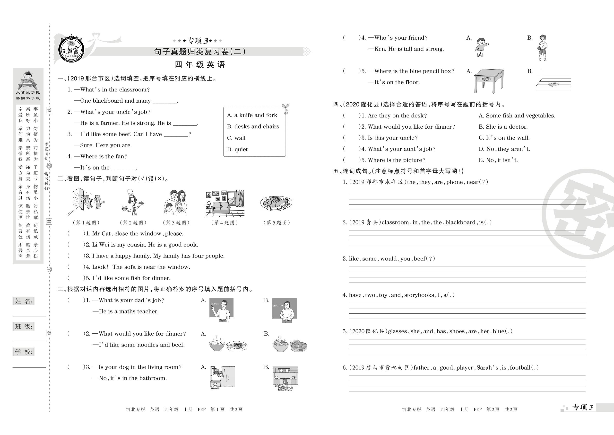王朝霞期末专项卷——句子、情景交际真题归类复习四年级上册英语(PEP版)【0】