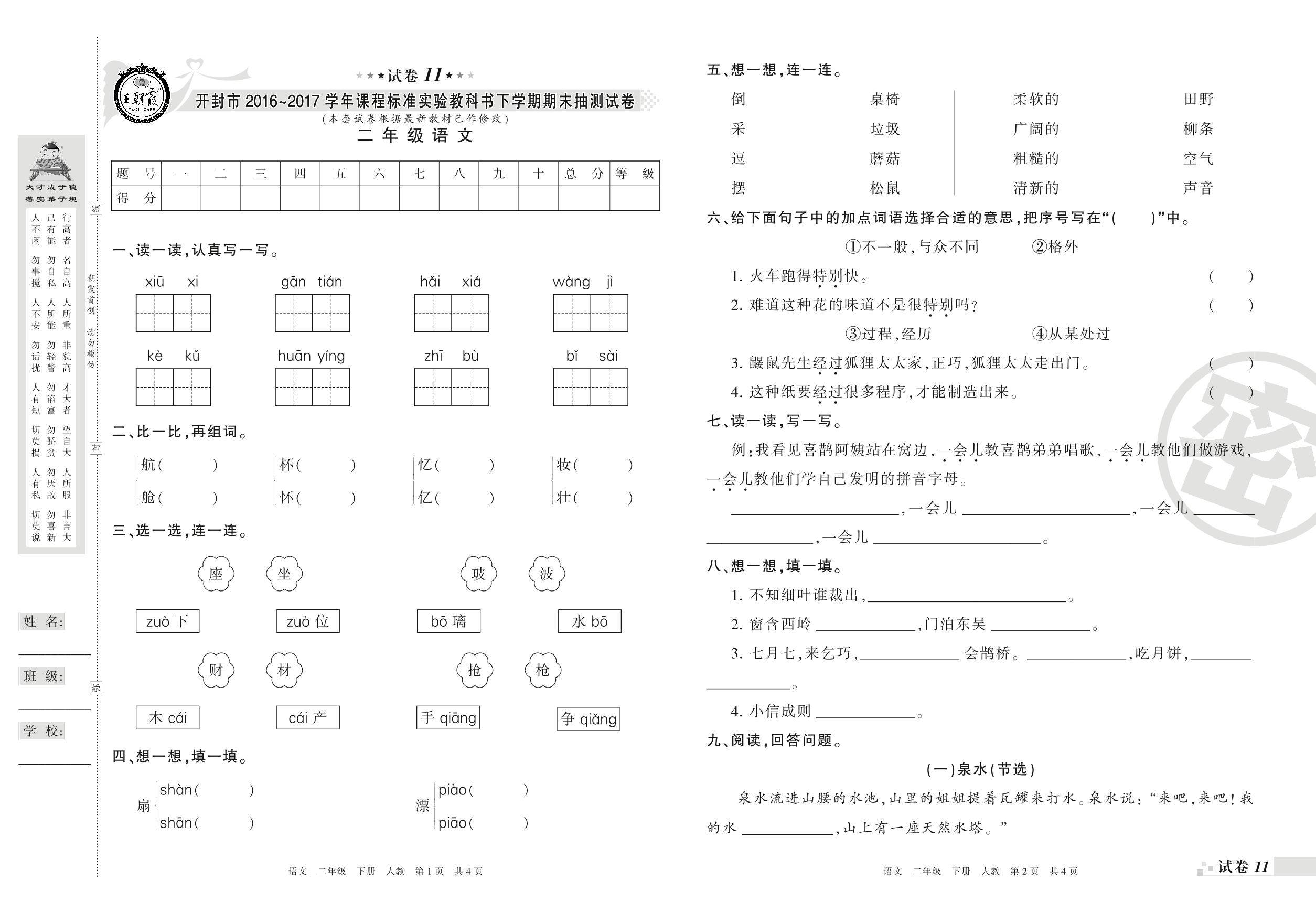 2016-2017学年第二学期开封市二年级语文试卷(人教版)【11】