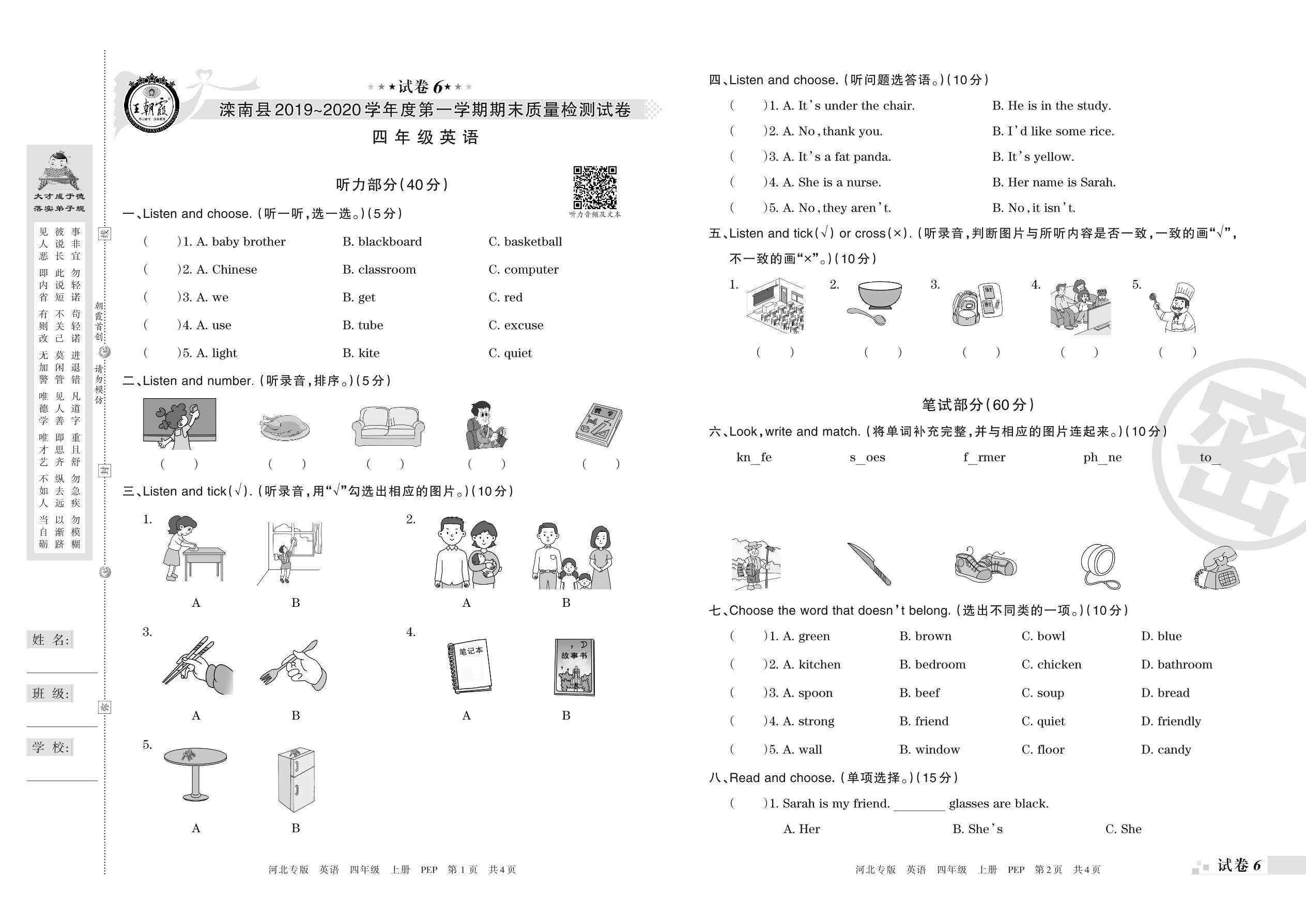 2019-2020学年第一学期唐山市滦南县四年级英语试卷(PEP版)【6】