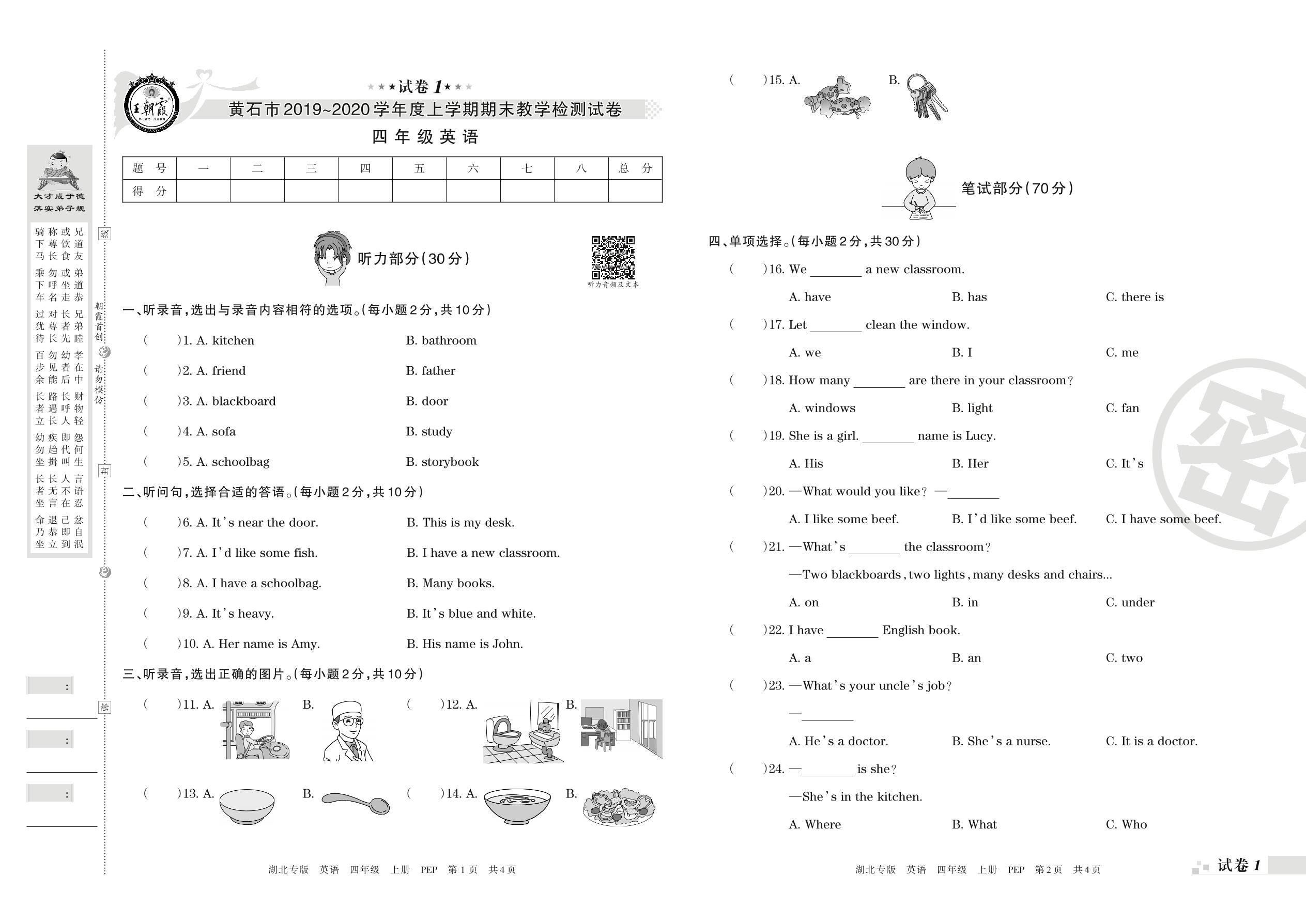 2019-2020学年第一学期黄石市四年级英语试卷(PEP版)【1】