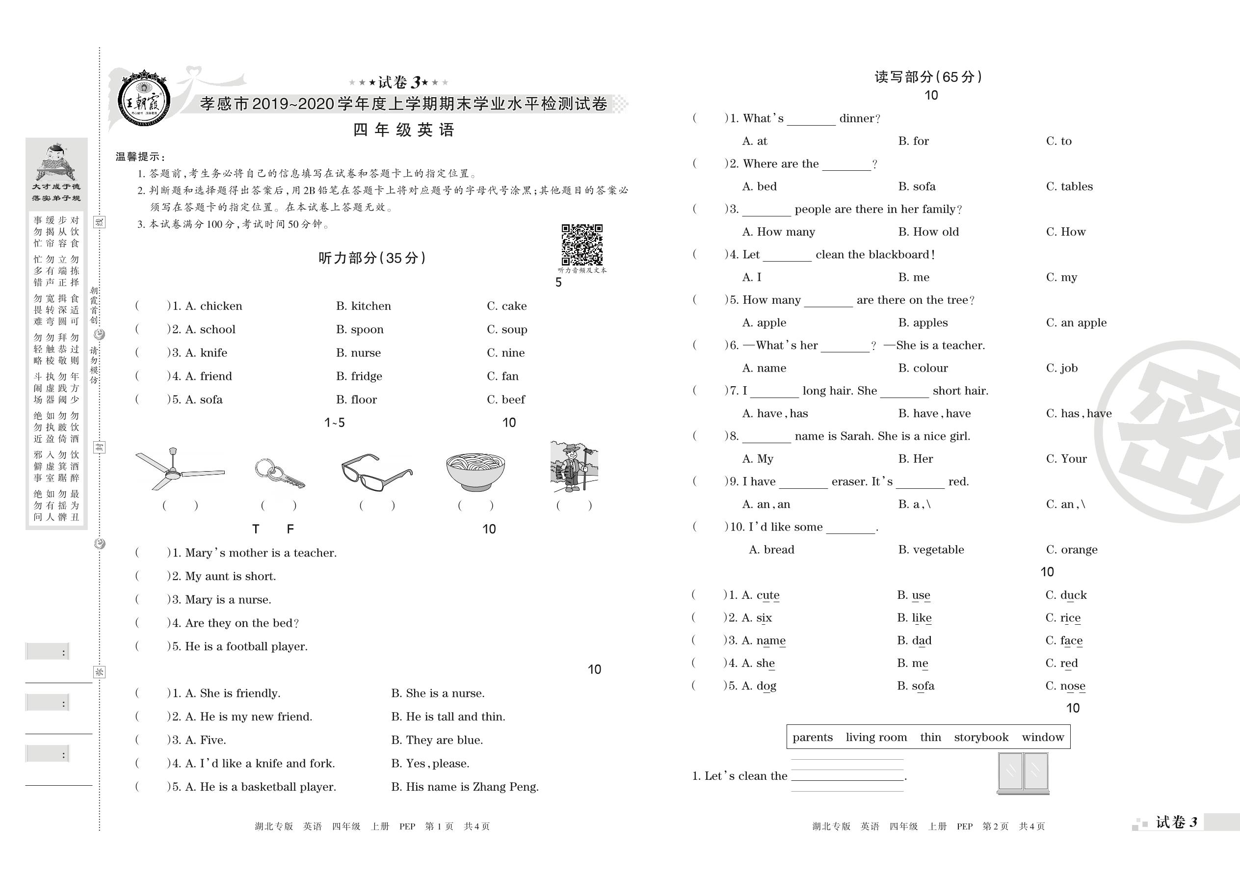 2019-2020学年第一学期孝感市四年级英语试卷(PEP版)【3】
