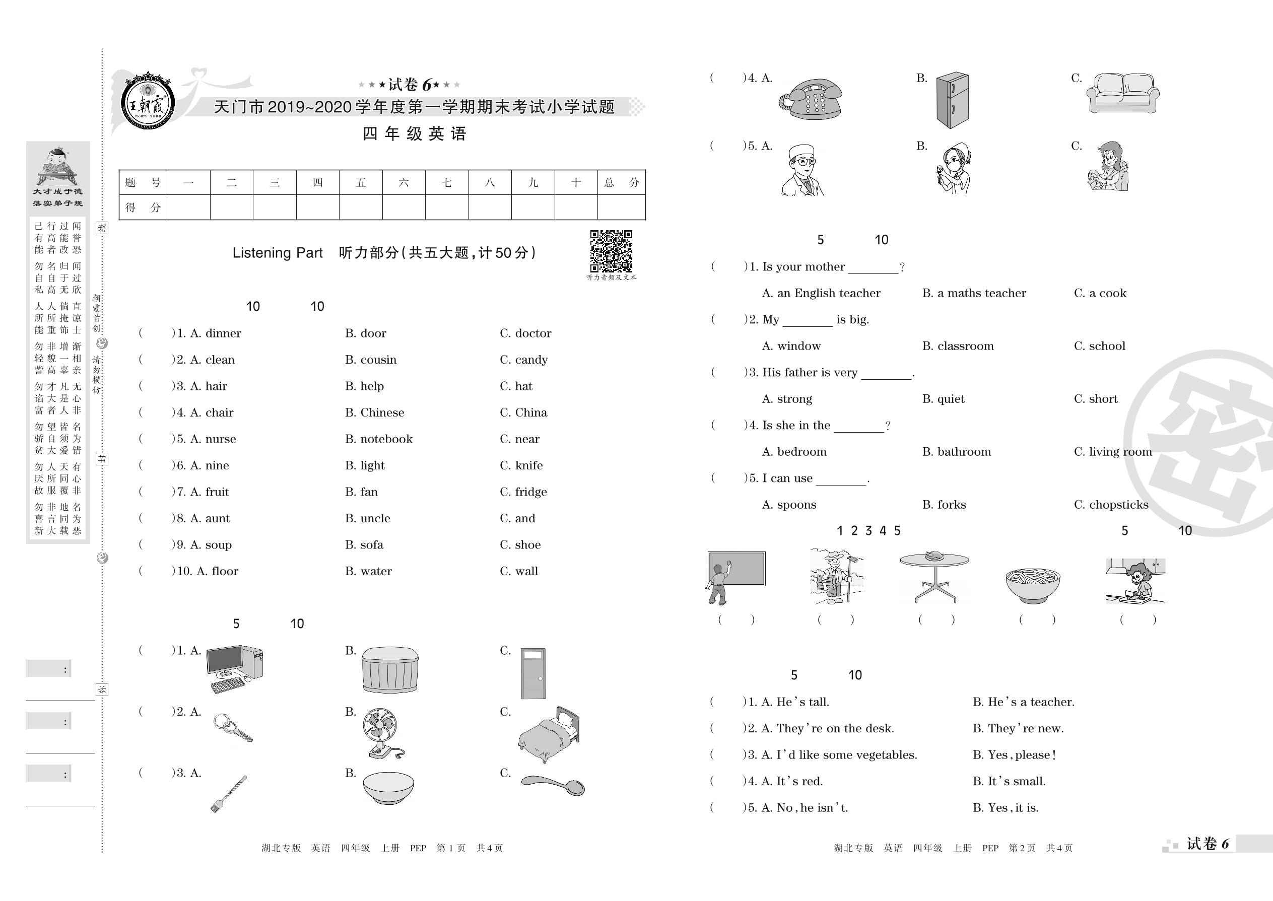2019-2020学年第一学期天门市四年级英语试卷(PEP版)【6】