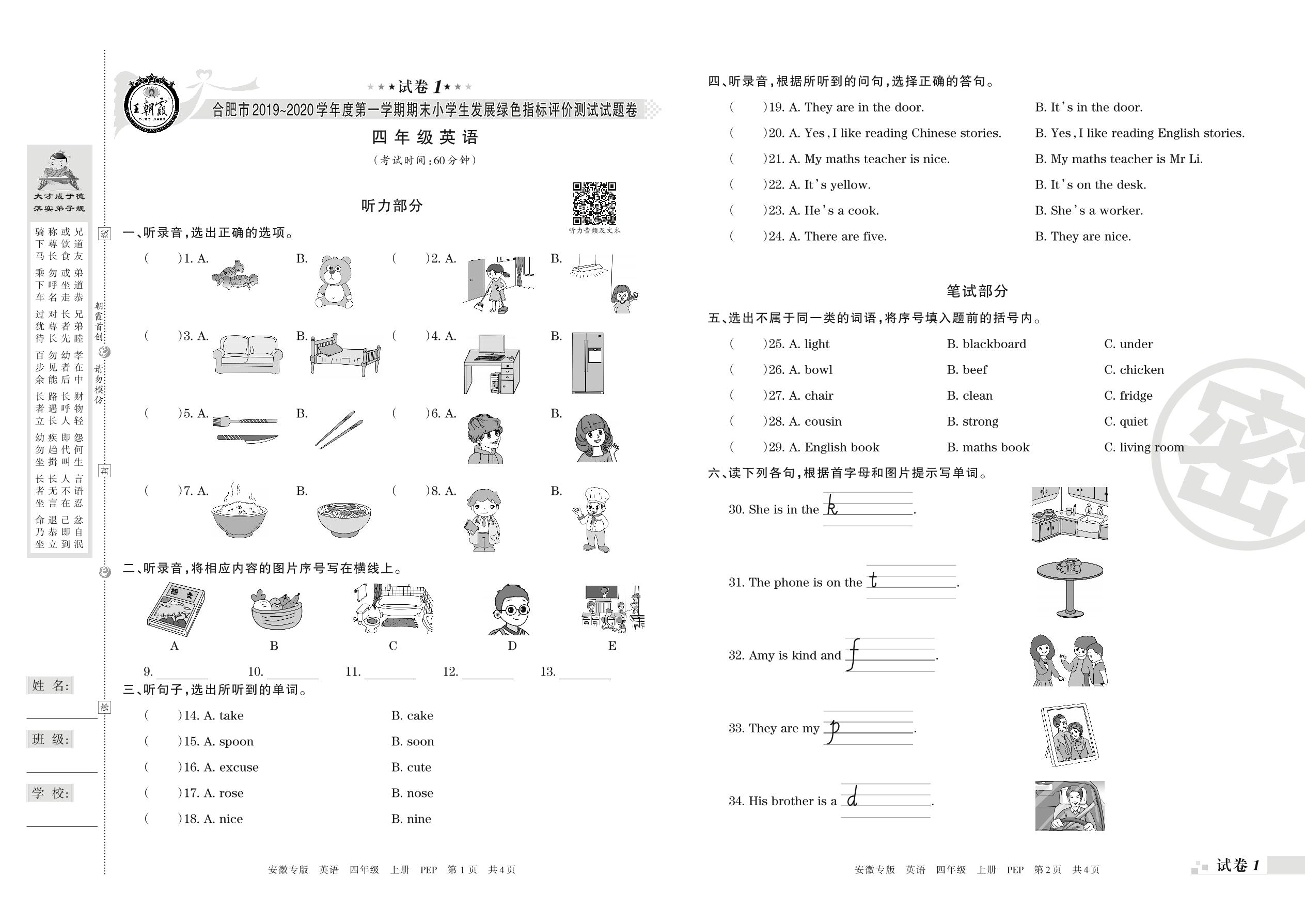 2019-2020学年第一学期合肥市四年级英语试卷(PEP版)【1】