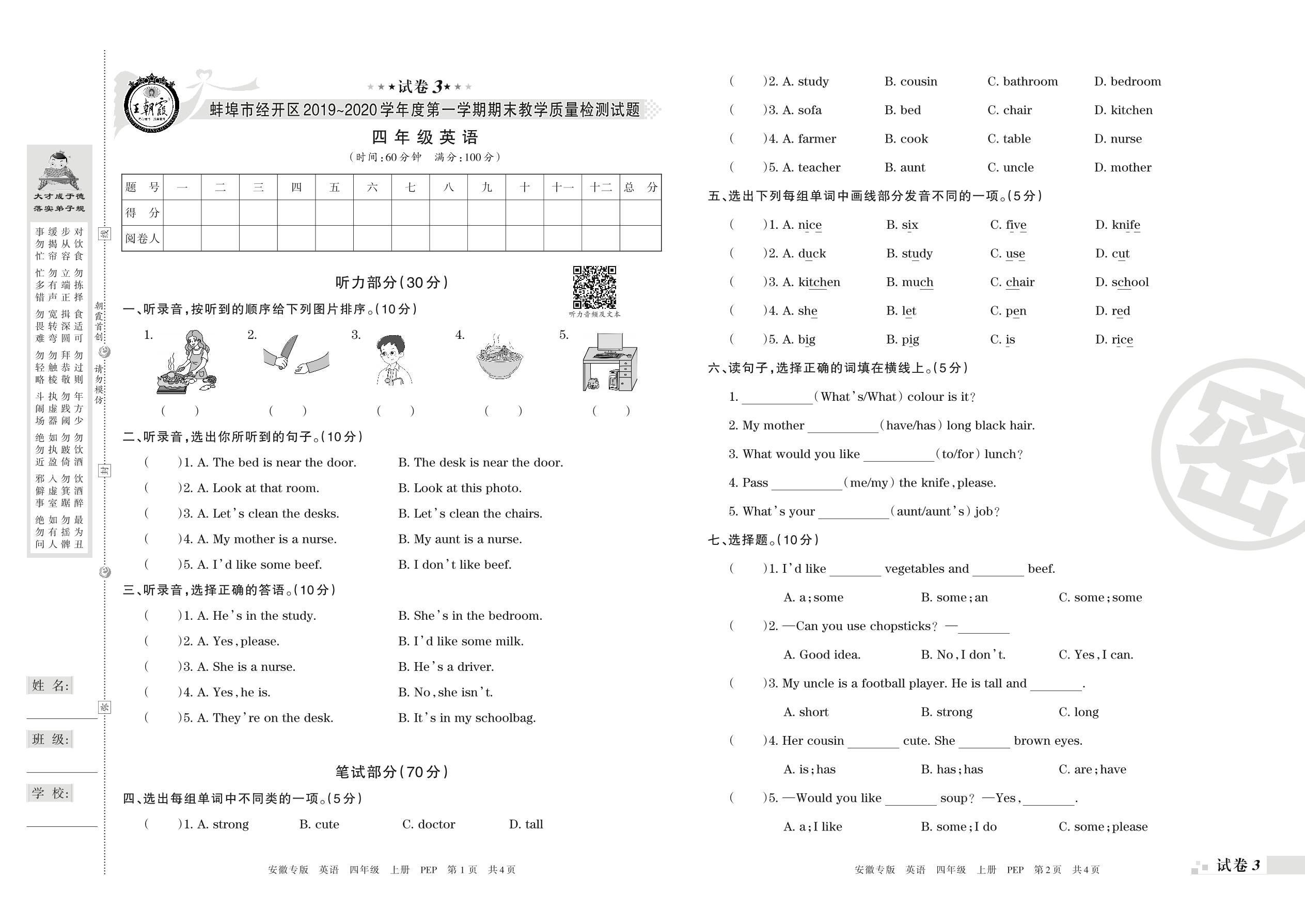 2019-2020学年第一学期蚌埠市经开区四年级英语试卷(PEP版)【3】